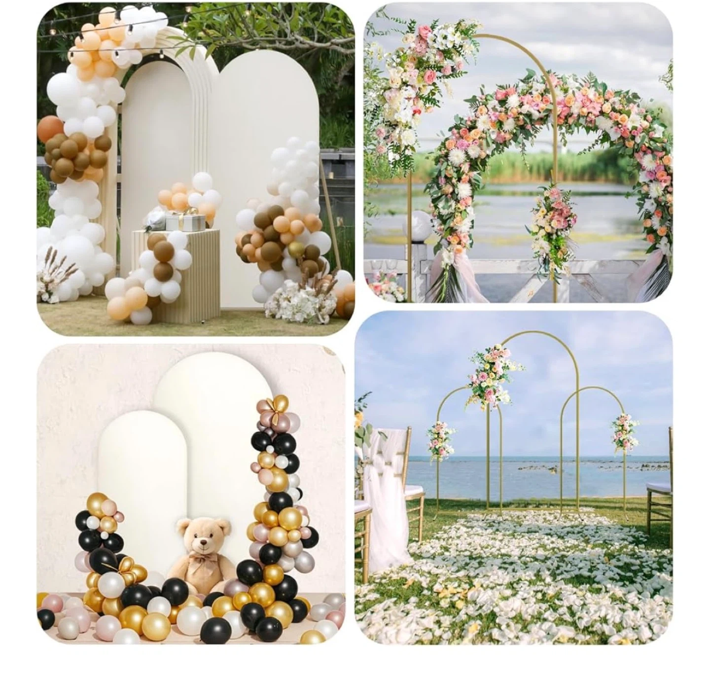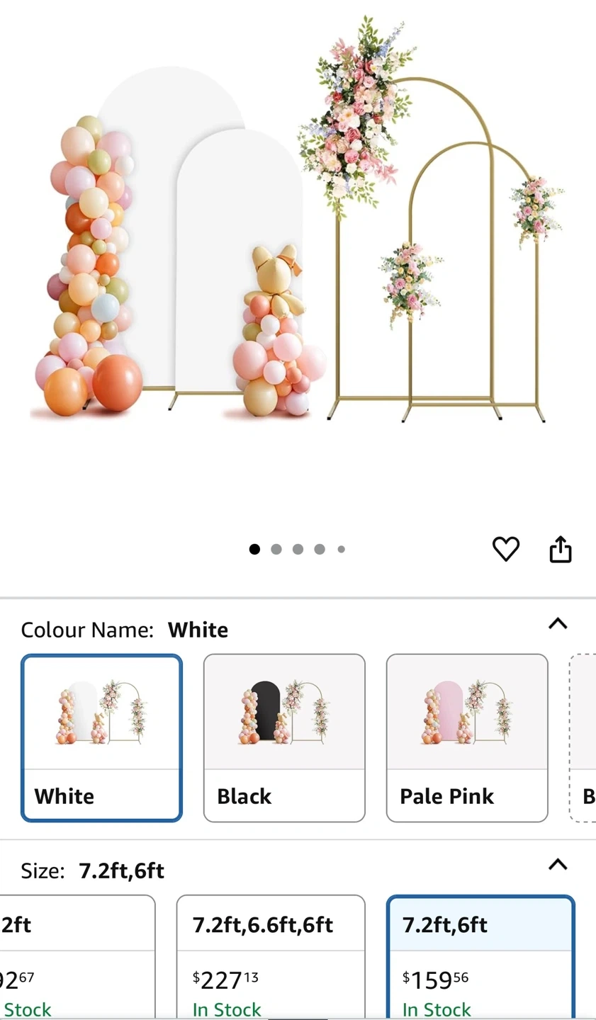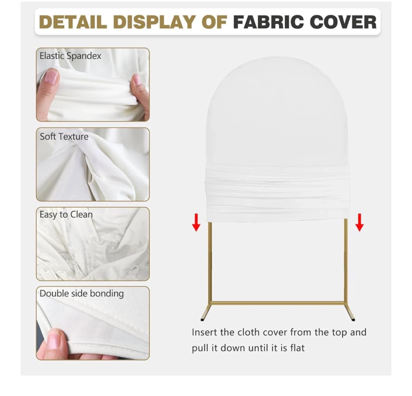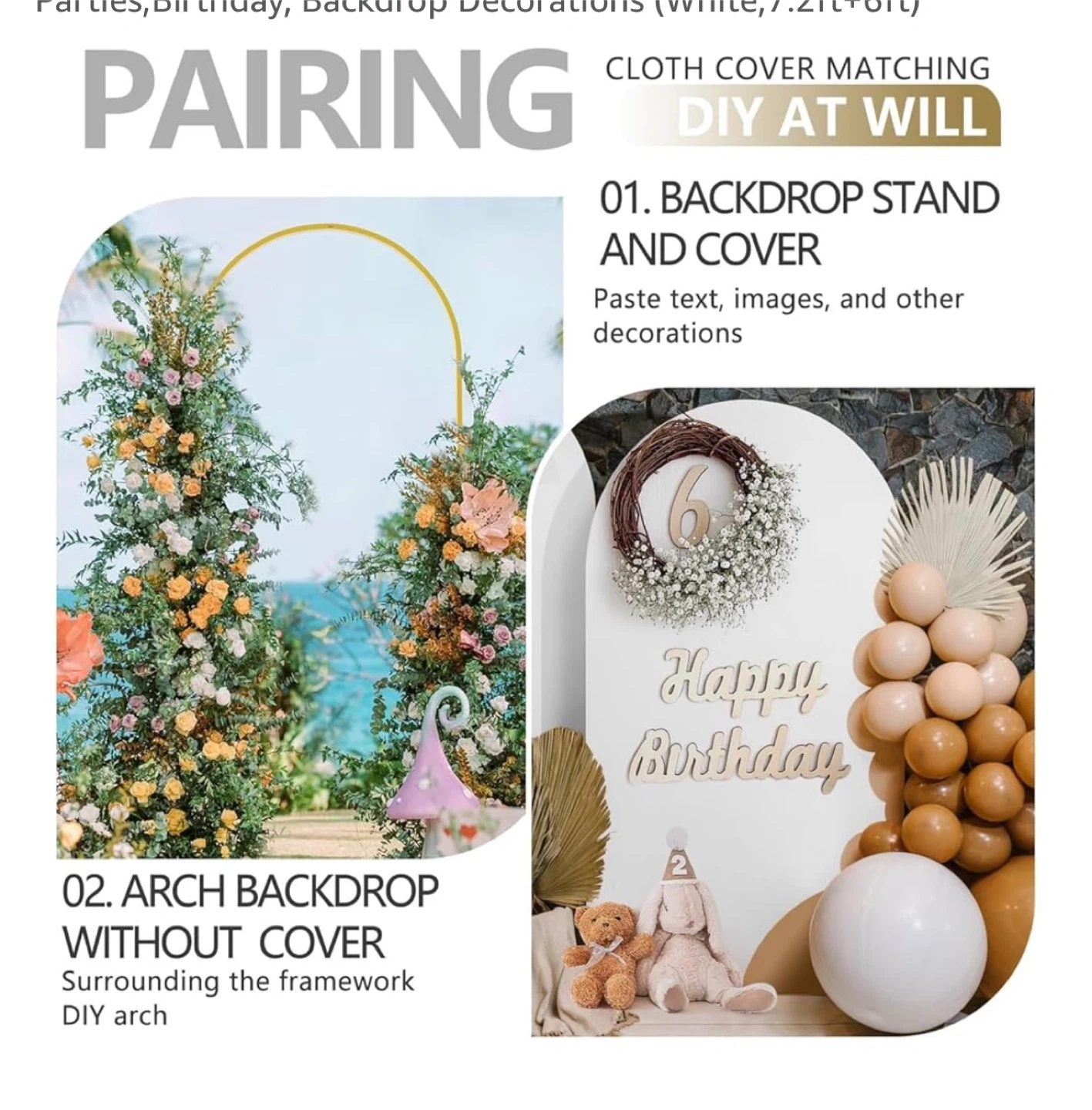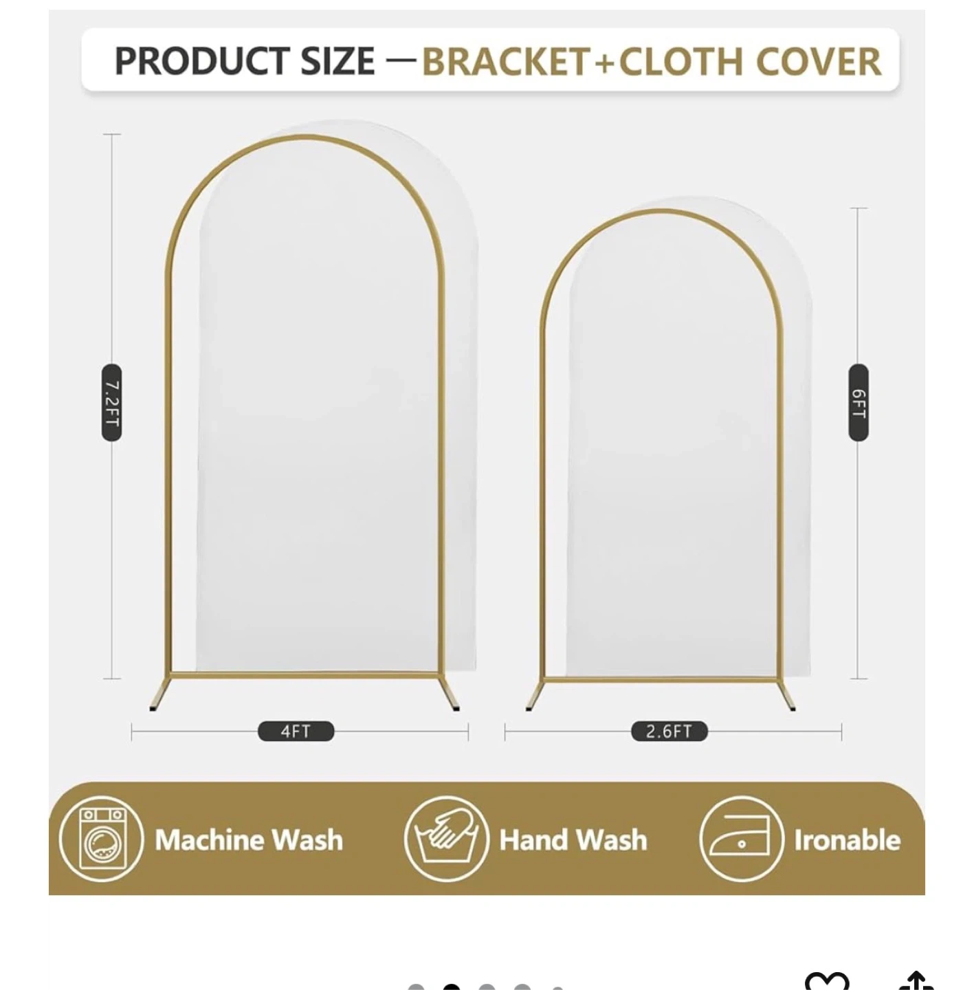 Selling a white arch backdrop stand. It's easy to assemble and perfect for parties or events! - Sizes: 7.2ft and 6ft - Elastic spandex fabric cover - Soft texture - Easy to clean - Machine washable, hand washable, and ironable