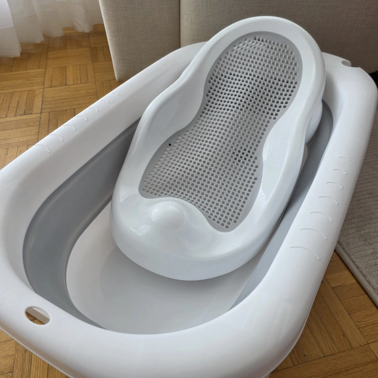 Selling a baby bathtub in NEW condition! It comes with an infant support insert, perfect for newborns and smaller babies. The tub is white and grey, and it's a nice size for most bathrooms. Price on Amazon is about 140 + taxes