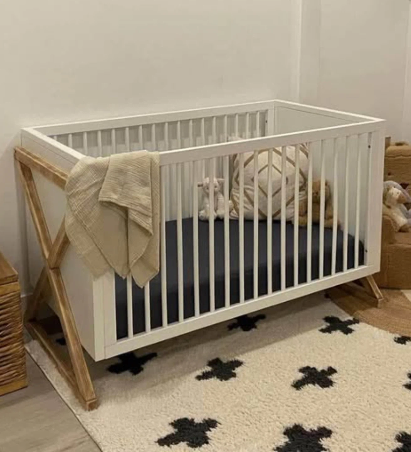 Selling a baby crib in great condition! It features a white frame with a dark blue mattress. Perfect for your little one's nursery