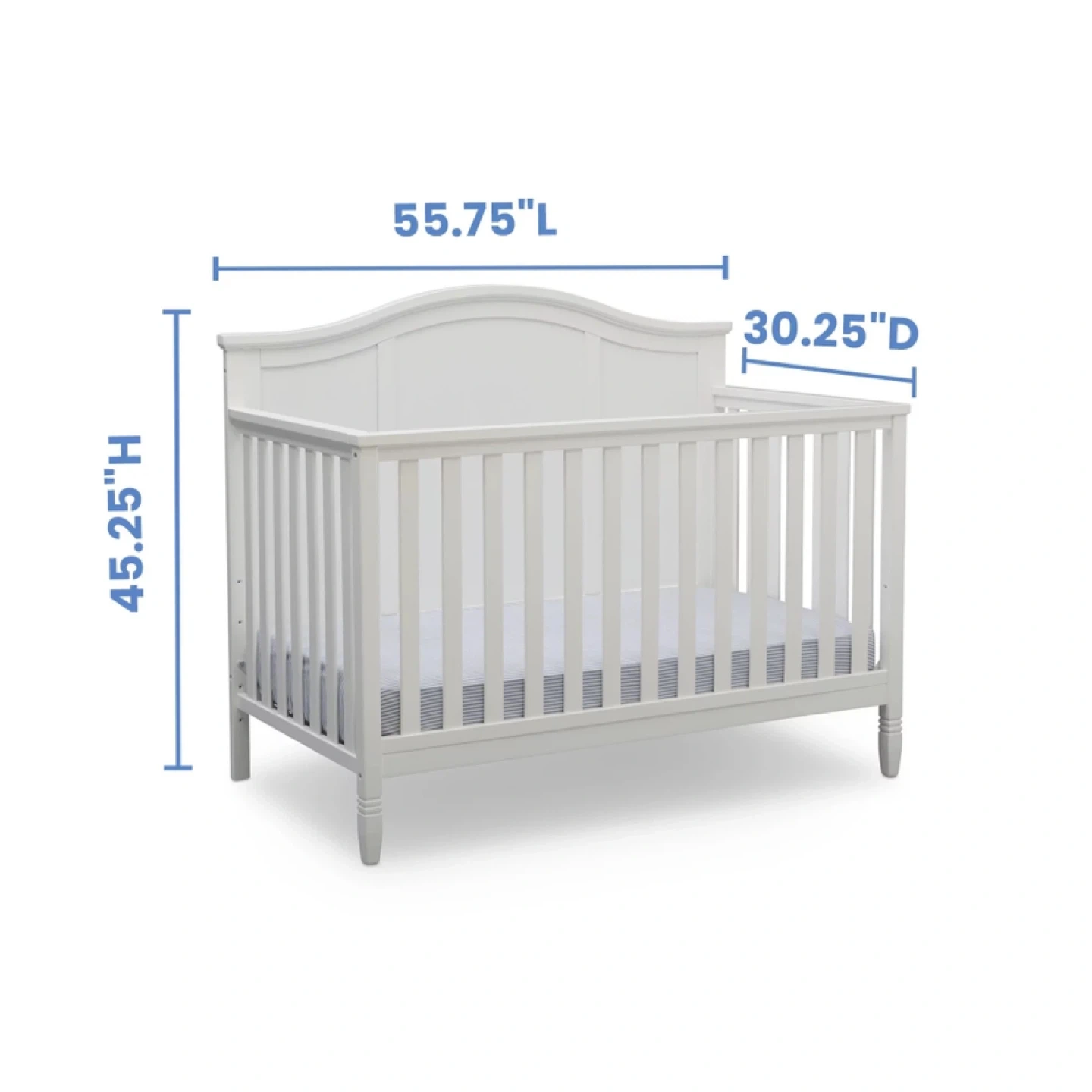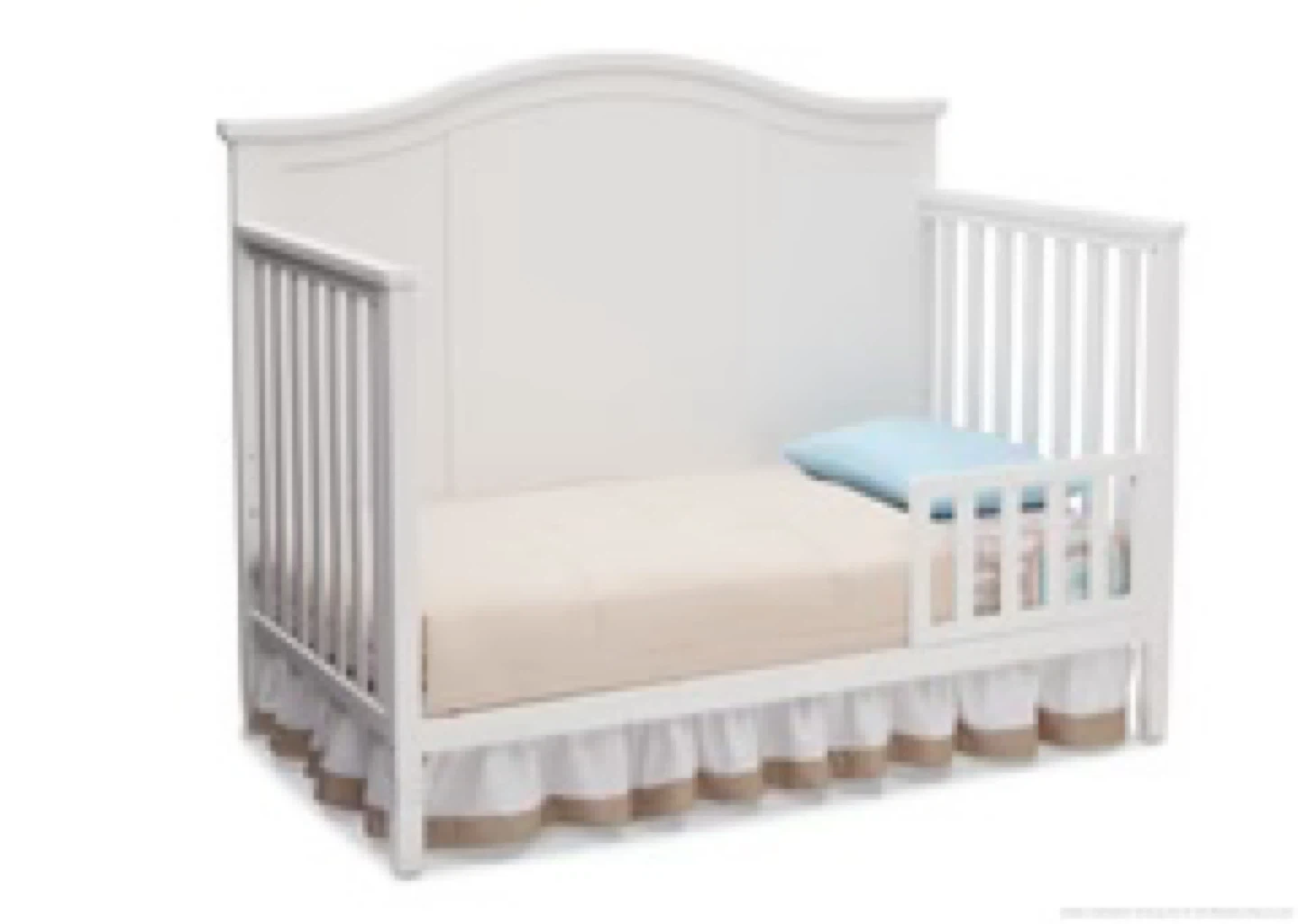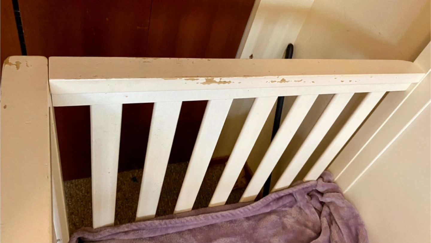Selling a baby crib in white. It shows some signs of wear and tear, as seen in the pictures. no missing screws
