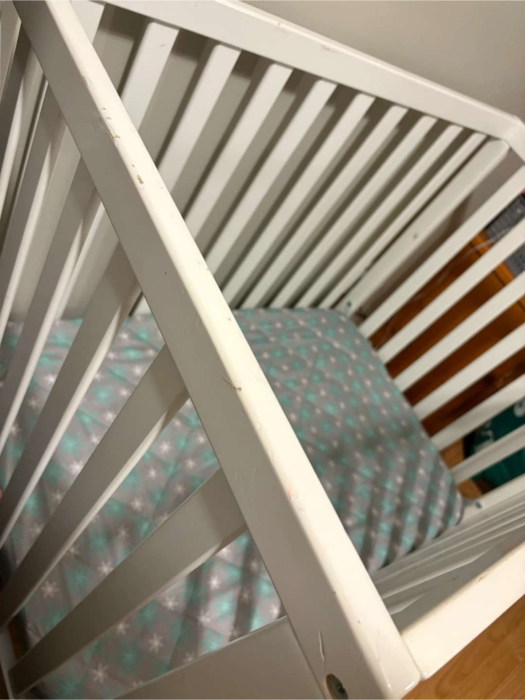 Selling a white mini crib. It's in good condition and ready for a new home. It has 2 stages for newborn and toddlers. Perfect for small spaces comes with mattress and 2 fitted covers.