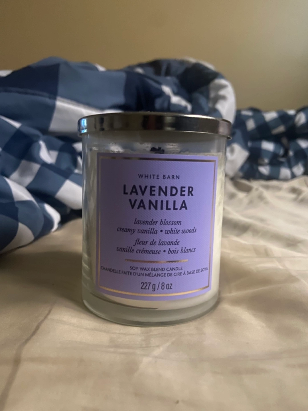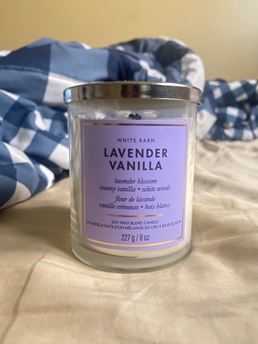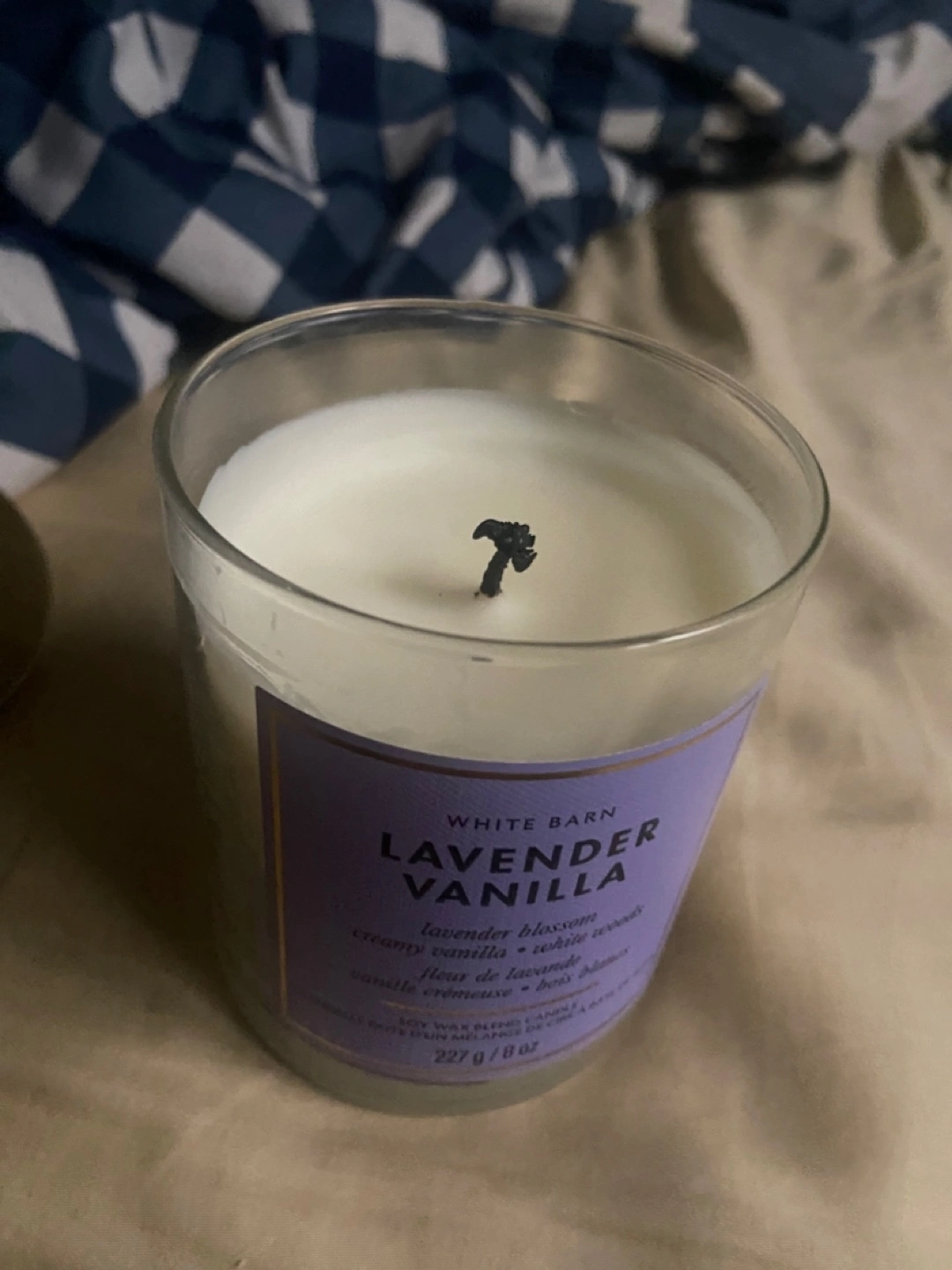 Selling a White Barn Lavender Vanilla candle. It's a Bath and Body shop soy wax blend candle with a lovely lavender blossom, creamy vanilla, and white woods scent. The candle weighs 227g / 8 oz