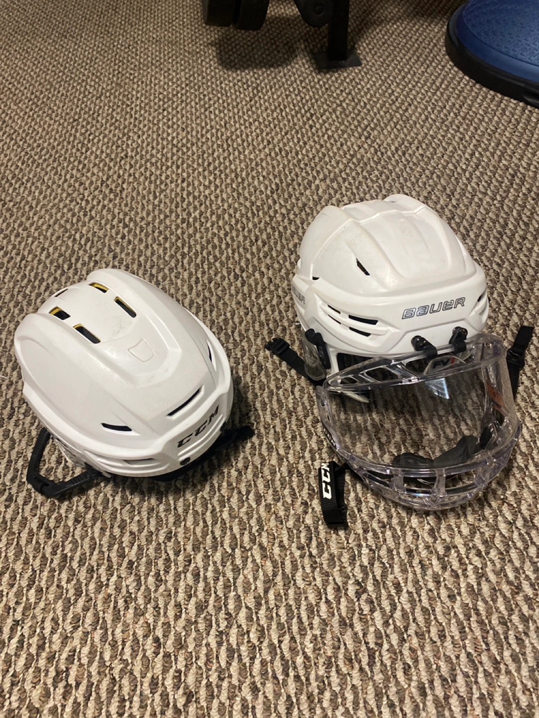 Selling a Bauer hockey helmet along with a CCM hockey helmet. Both are in good condition and ready for the rink! Also comes with a Bubble Cage. Willing to negotiate on the price. You can only buy one if you want. Open to anything!