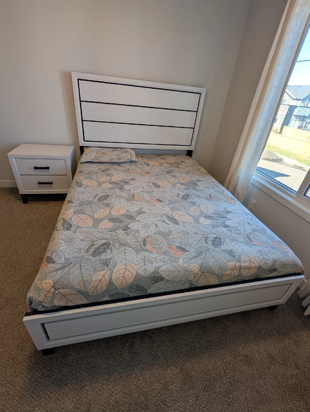 Selling a bed frame with a headboard and matching nightstand. The set is in great condition and would look lovely in any bedroom. The bed frame is a simple, modern style in white, and the nightstand has two drawers for storage. Perfect for adding a touch of elegance to your space!