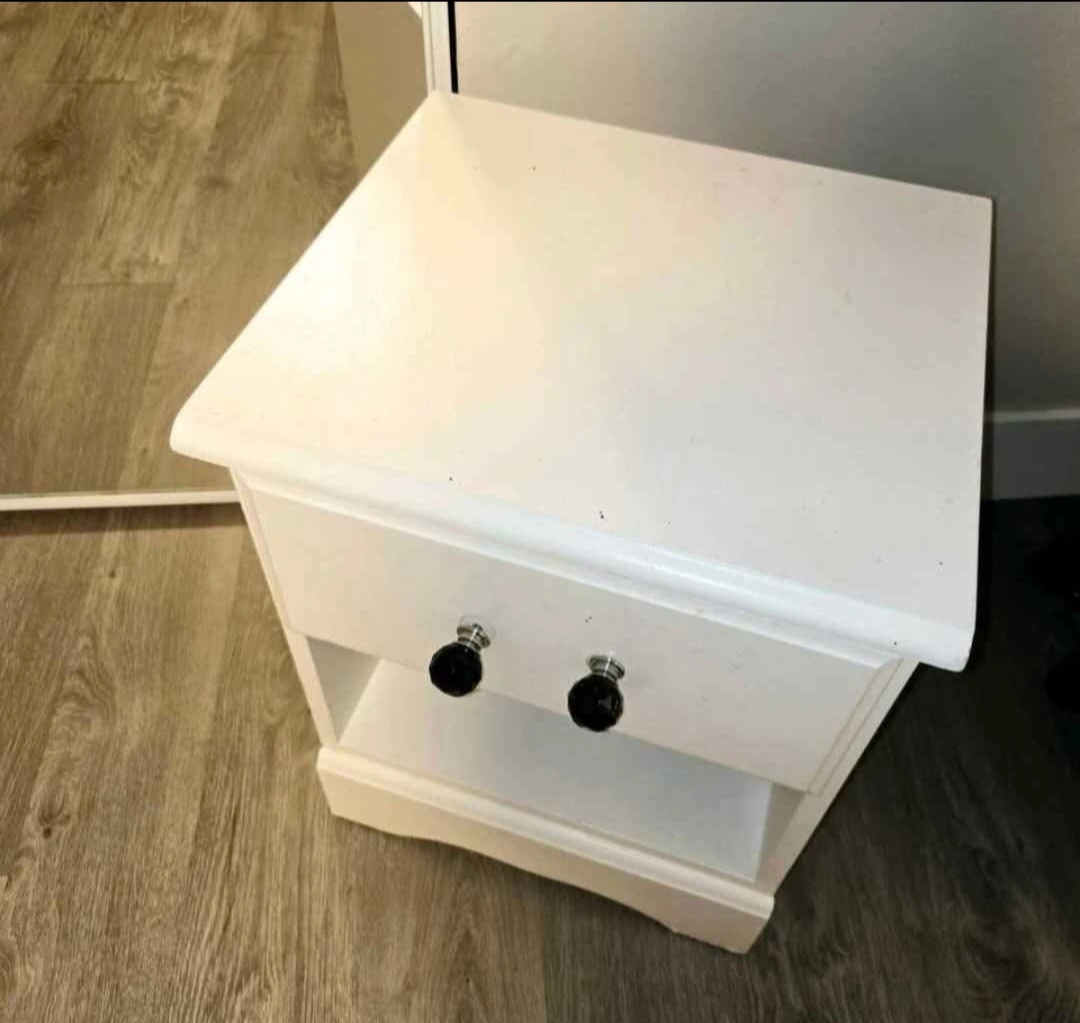 A cute white bedside table with a drawer and open shelf. Perfect for a small space or as an accent piece in your bedroom! $ 60 prices firm pickup only in oliver square. No holds cash only