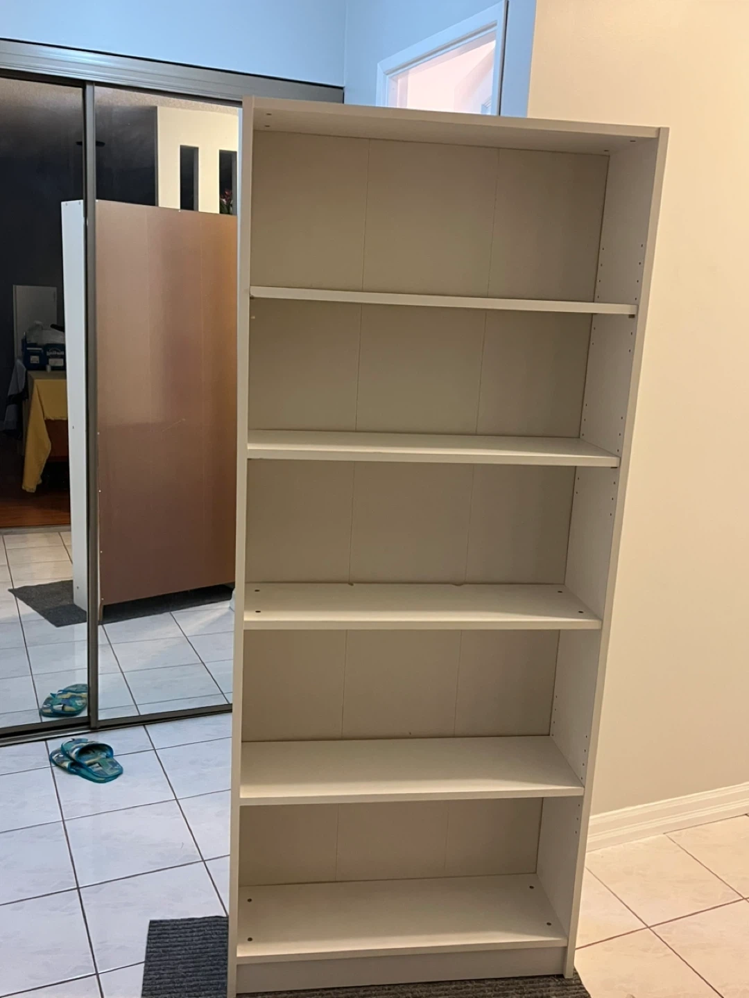 A white bookshelf in excellent condition! It has six shelves, perfect for storing books or displaying items. It's simple and practical, perfect for any room. There's some damage to the center panel. 69 x 9.4 x 29.6 inches Pick up Finch and warden