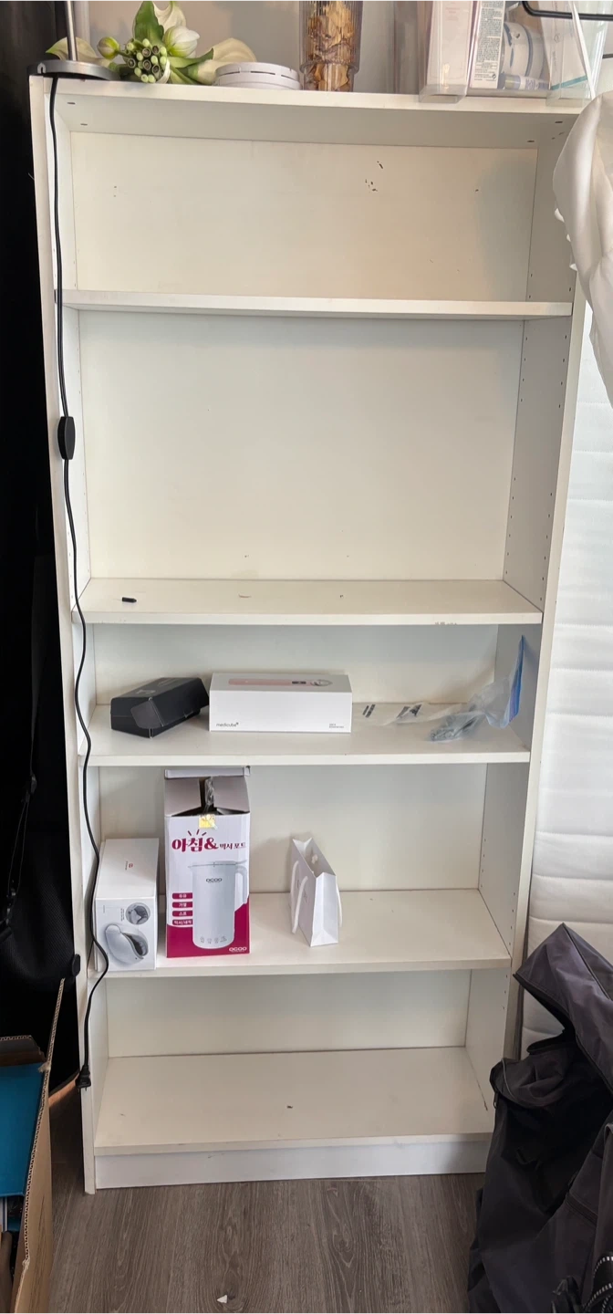 Selling a white bookshelf. It's in good condition and ready for a new home! Perfect for organizing your books, decor, or anything else you need to store. It's a simple and functional piece that will fit well in any room Only $10