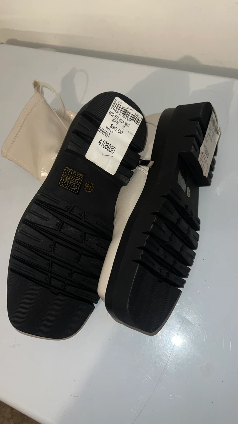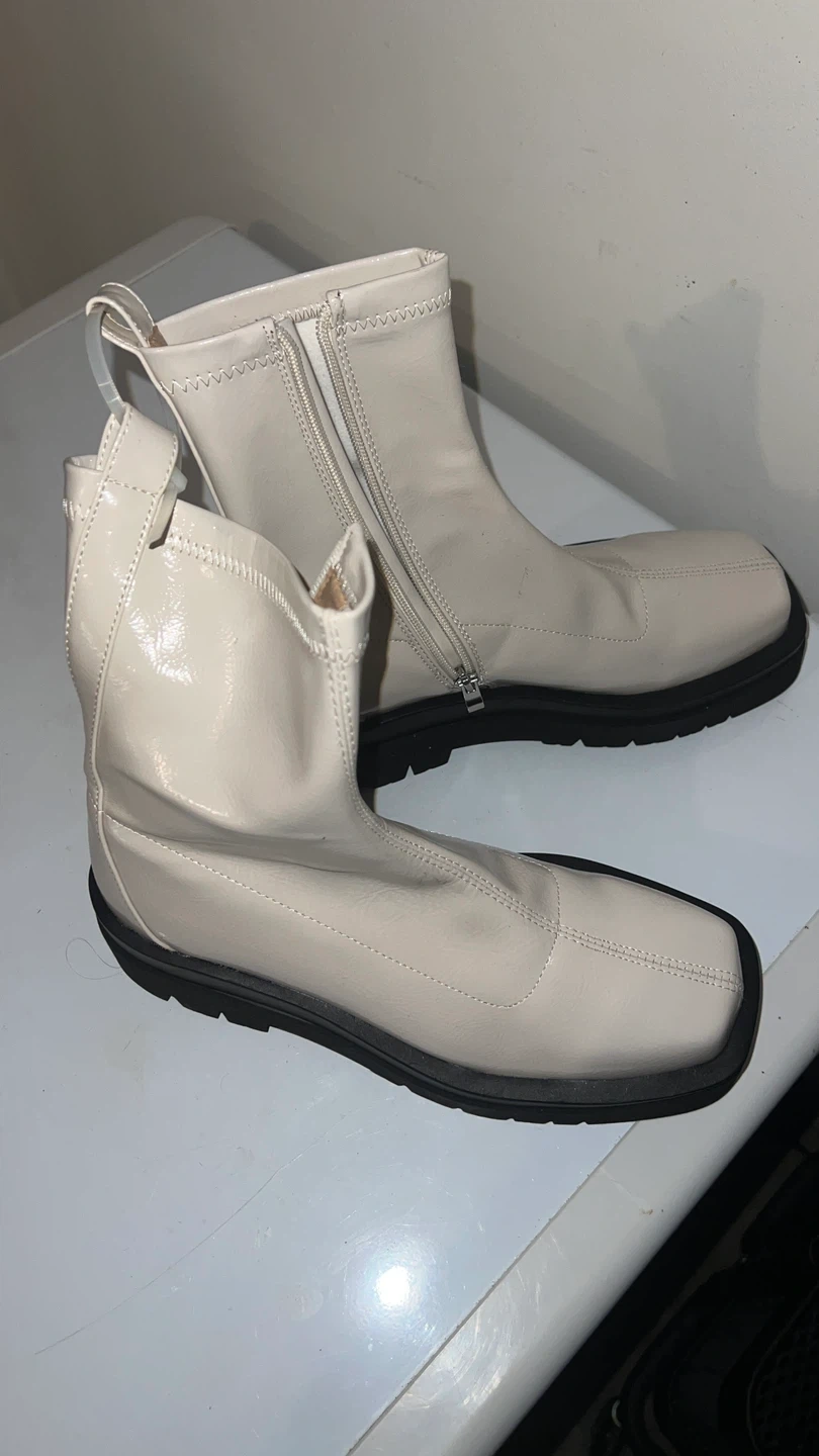 Never used boots in white. They're a size 8 and have a stylish, modern look. Perfect for adding a bit of edge to your outfits!
