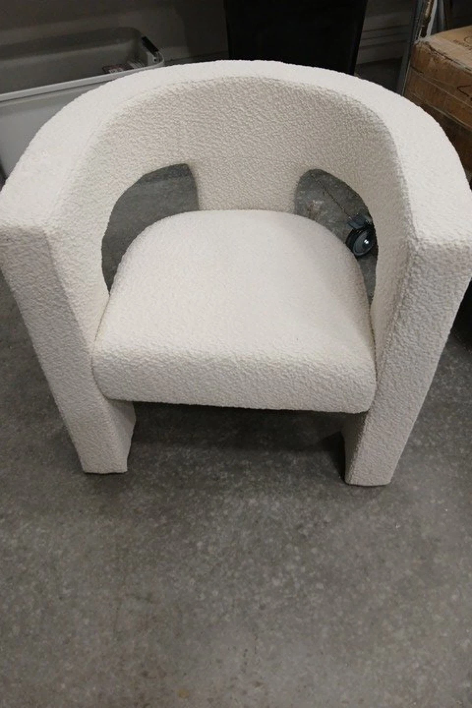 Selling a cozy white boucle accent chair! It's in great condition and would be a stylish addition to any room. The boucle texture is soft and inviting, perfect for curling up with a good book or just relaxing after a long day