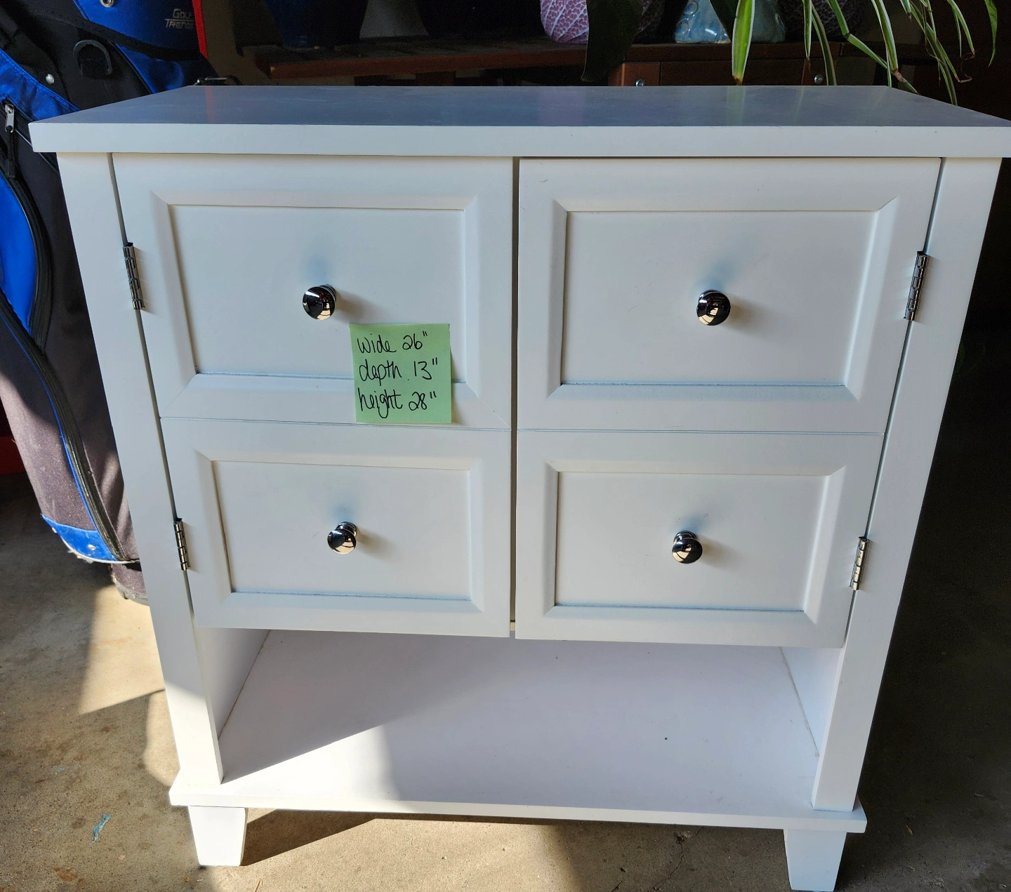 Here's a cute little cabinet! It's white and has two doors that look like drawers and a shelf. The dimensions are: - Width: 26 inches - Depth: 13 inches - Height: 28 inches Pick up on the west end in Lynnwood