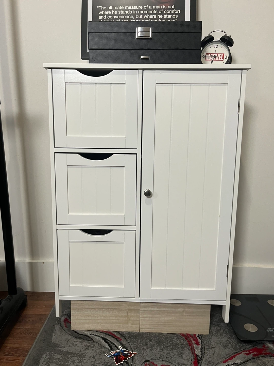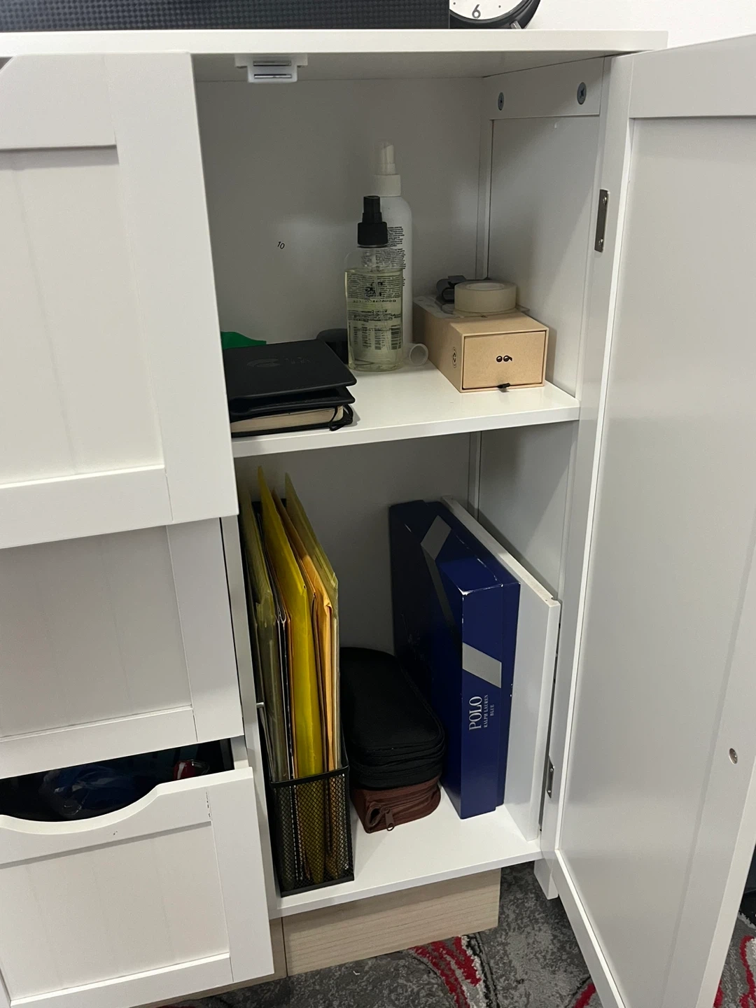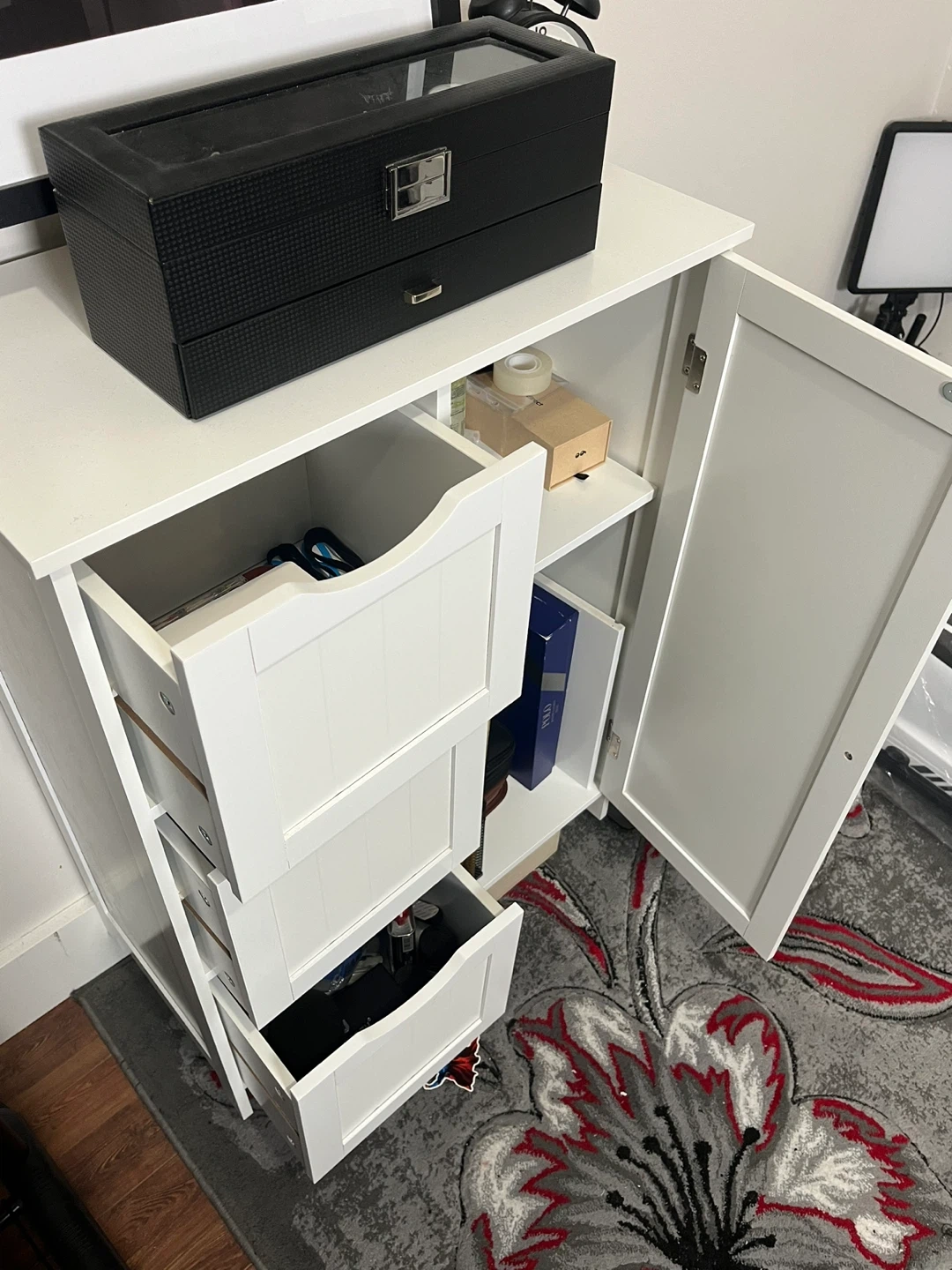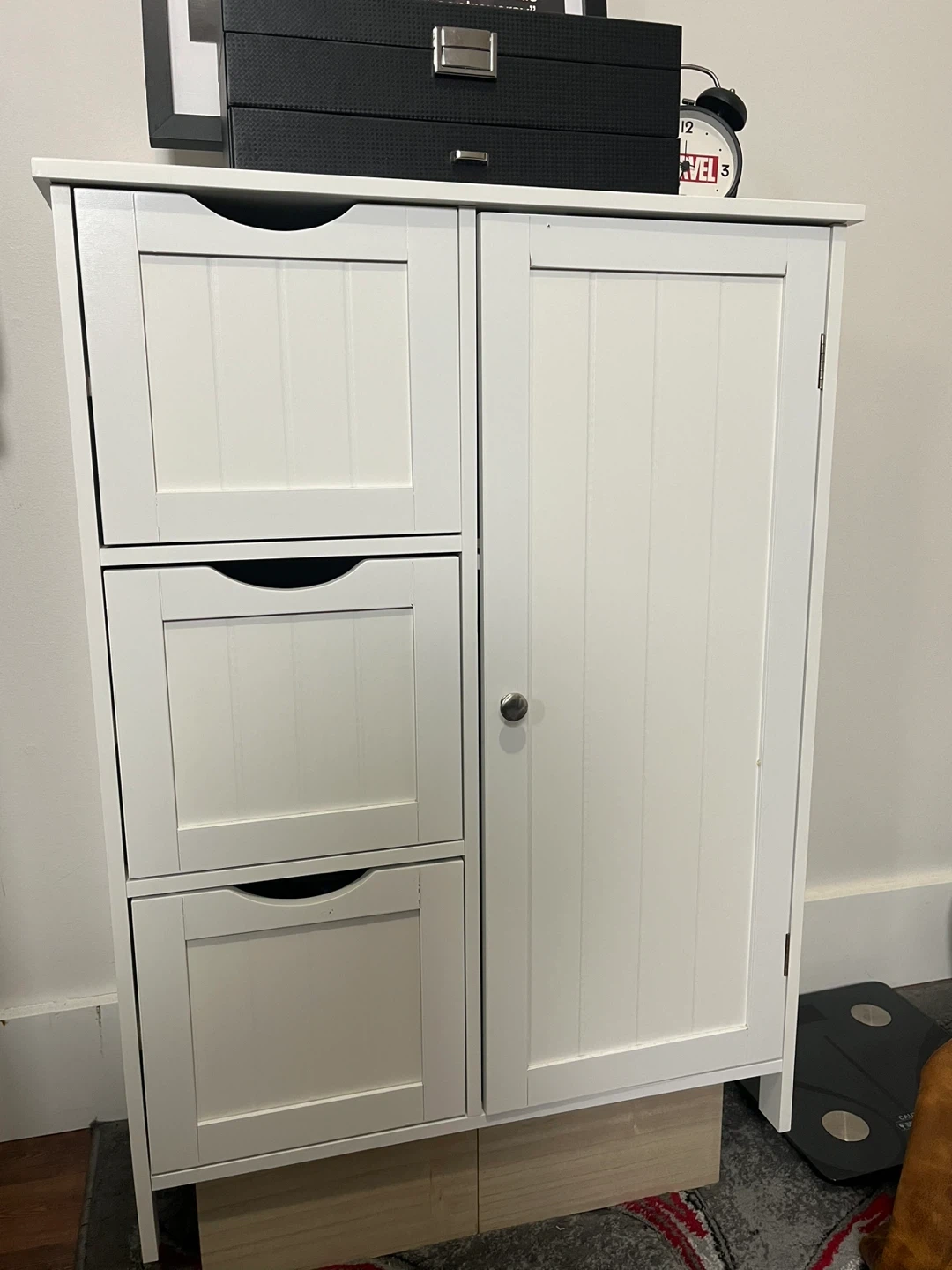 Selling a white cabinet in good condition! It has a cabinet door and three drawers for storage. Perfect for organizing your room essentials. A lot of storage Product Dimension: 30D x 60w x 81h centimeters