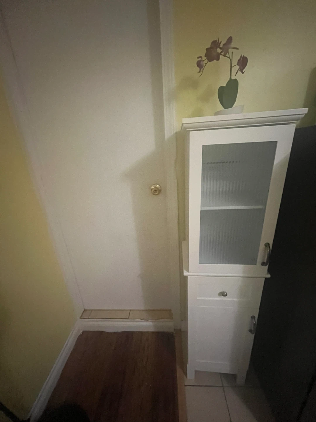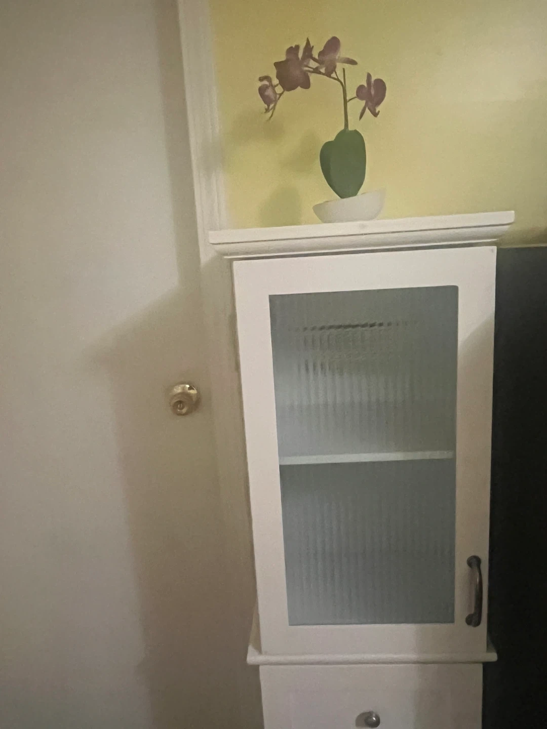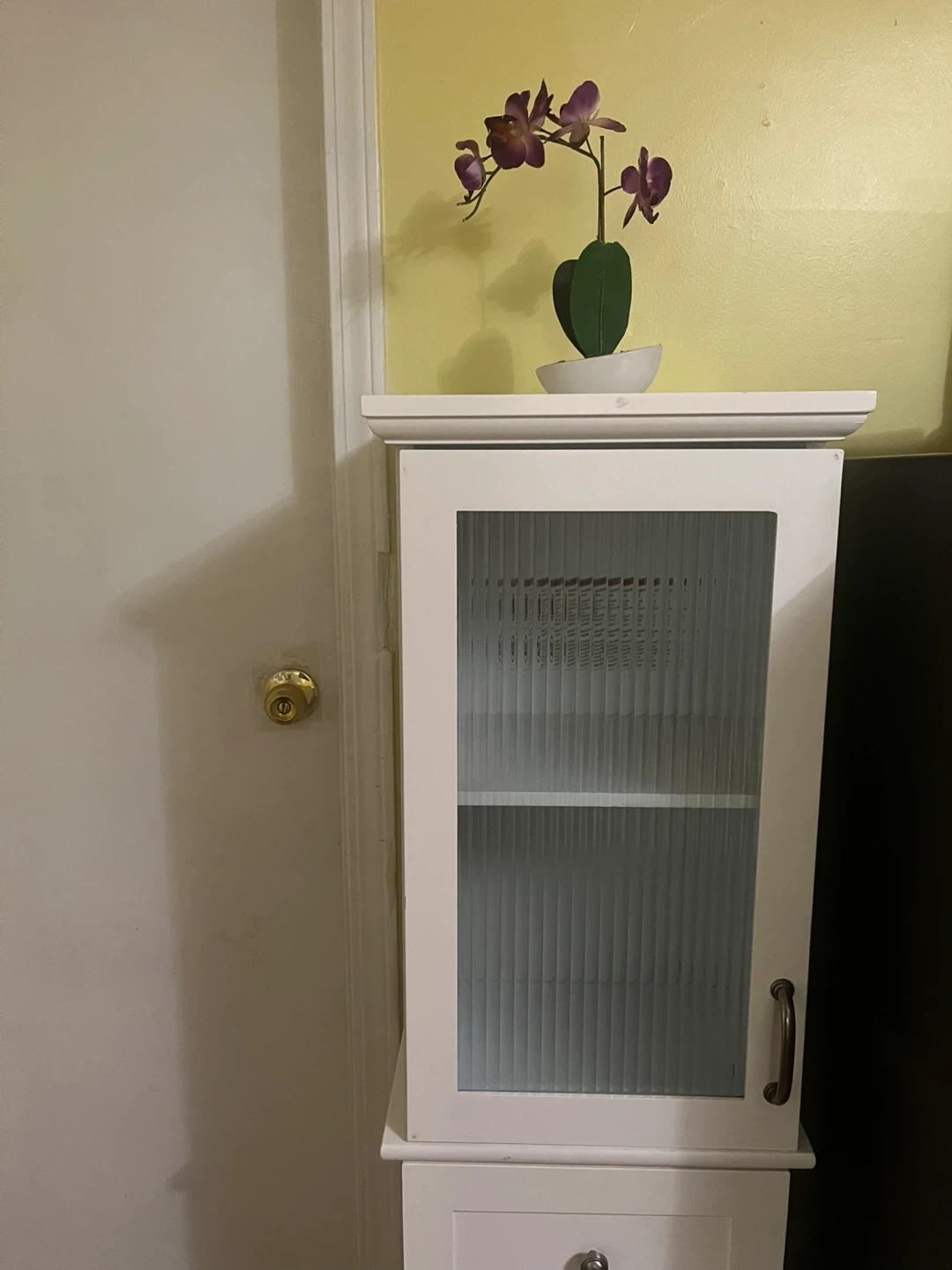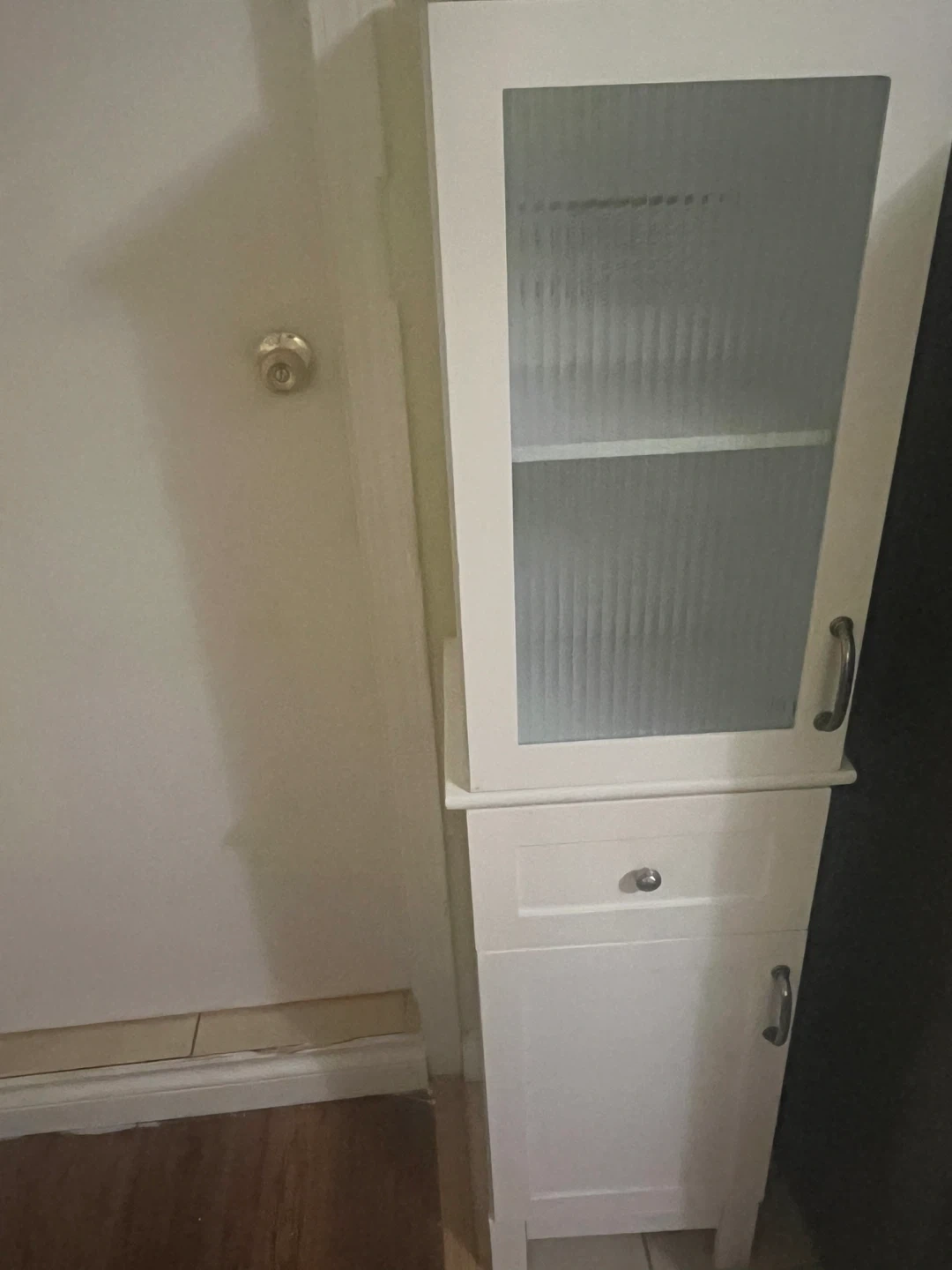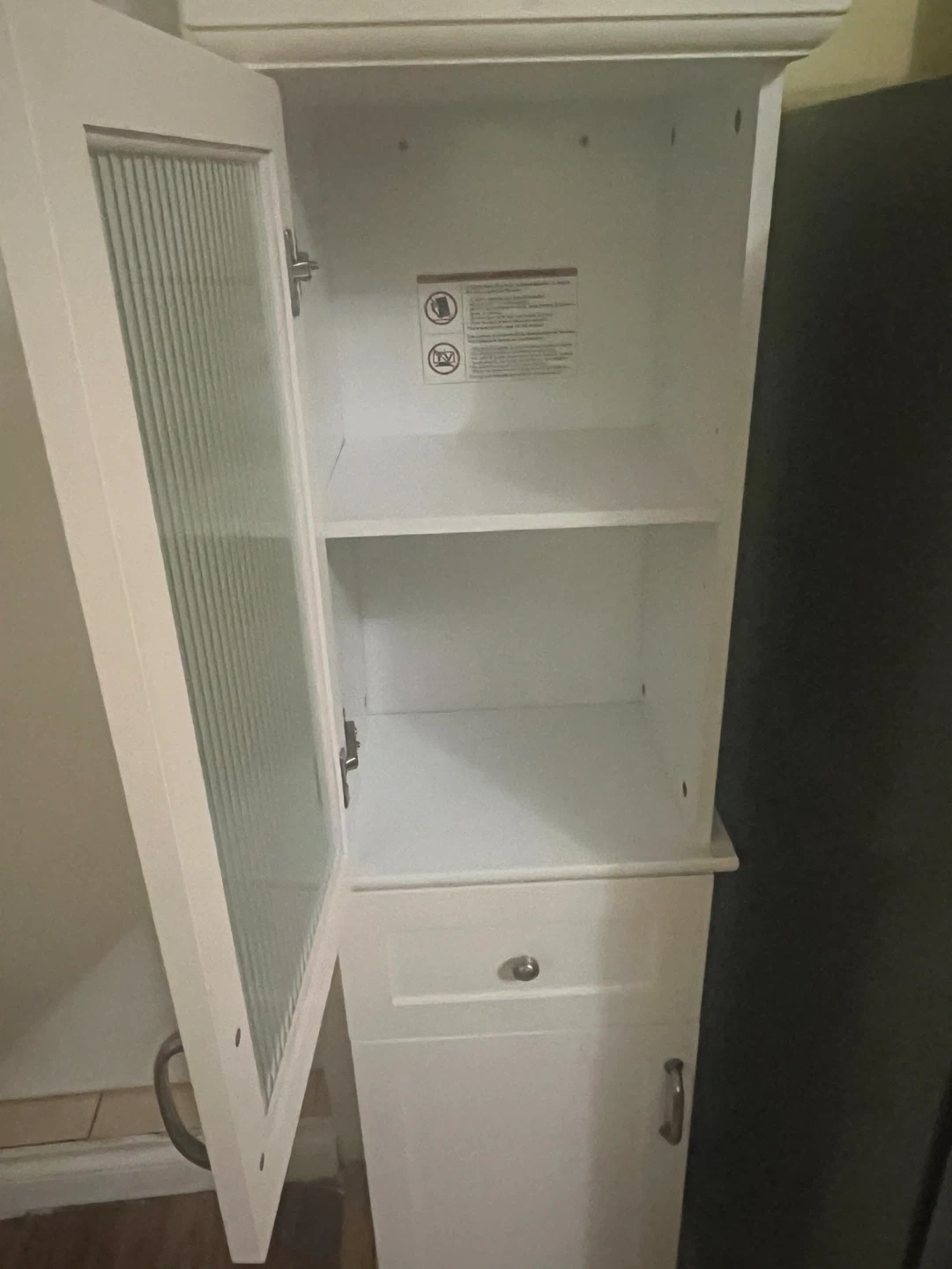 Selling a cabinet in great condition! It's very clean white with a glass door, perfect for storing toiletries or other bathroom essentials. It has a drawer at the bottom and a shelf inside the glass door section