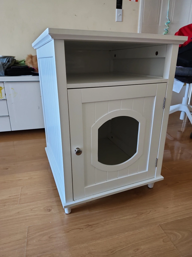 Selling a white cat litter box enclosure. It's in good condition and ready for a new home for your furry friend! This stylish piece of furniture will keep your cat's litter box hidden while blending seamlessly with your home decor