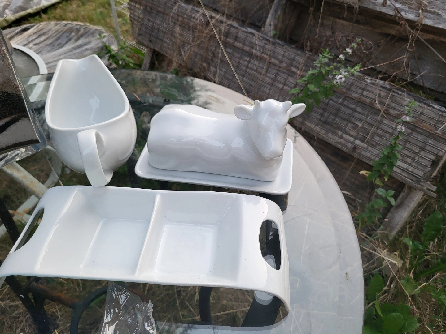 Selling a lovely white ceramic serving set! Includes a gravy boat, a divided serving dish, and a cute cow-shaped butter dish. Perfect for adding a touch of charm to your next dinner party or family gathering