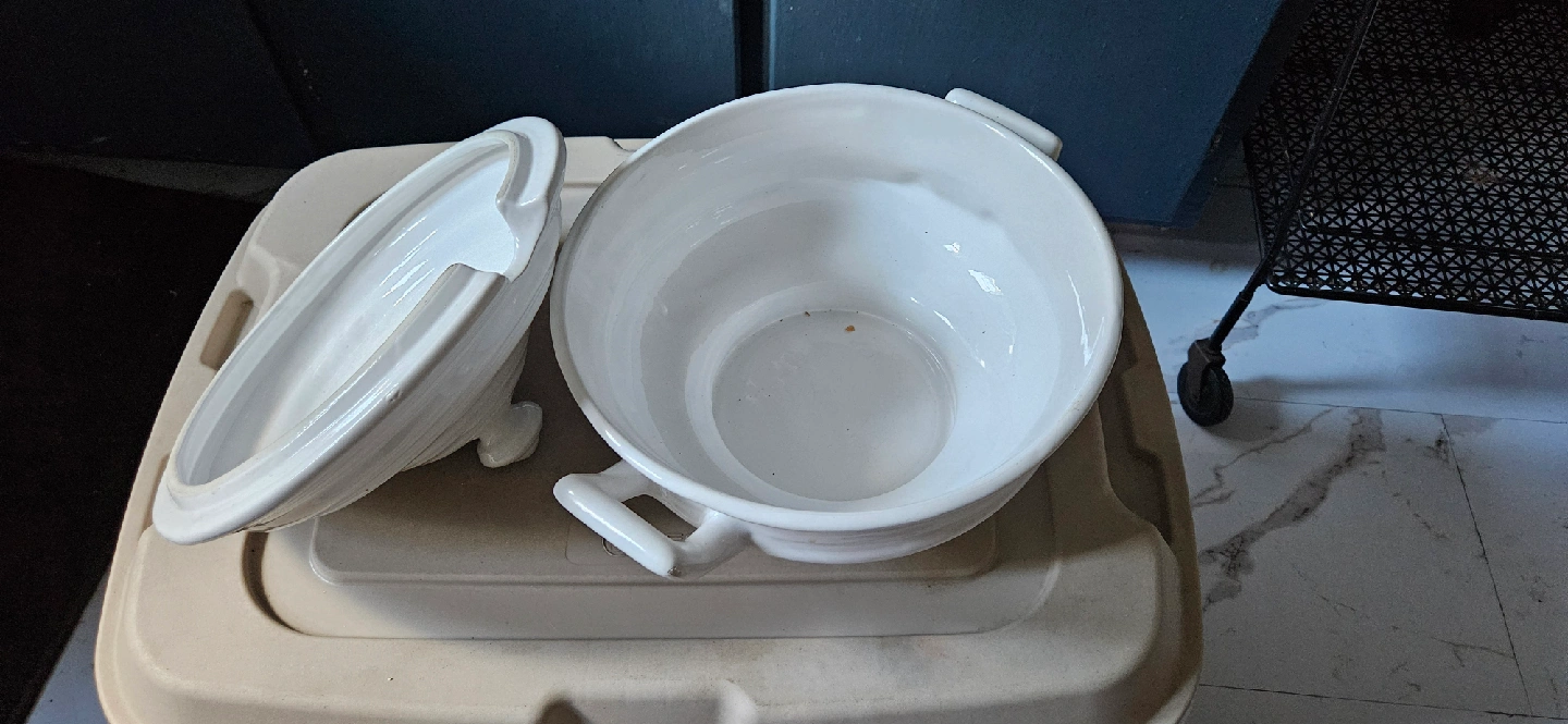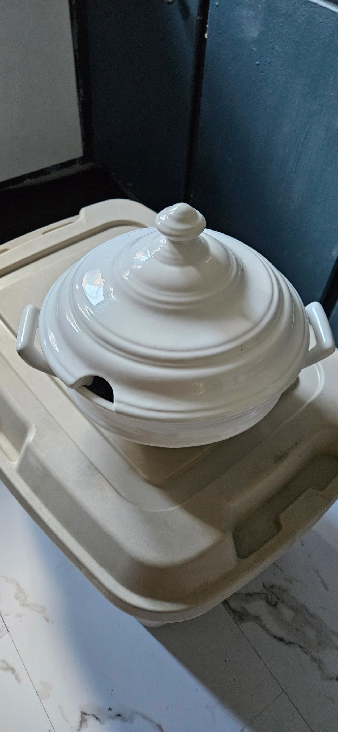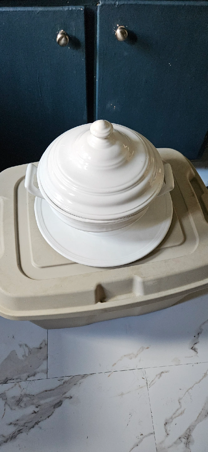 Selling a lovely white ceramic tureen complete with a lid and matching platter. It's in great condition and would be a beautiful addition to any dining set. Perfect for serving soups or stews!