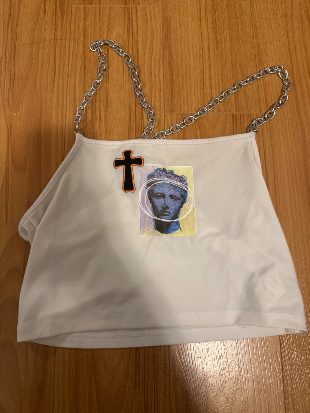Here's a cute white crop top with chain straps! It features a cross and a graphic print on the front. Great for summer!