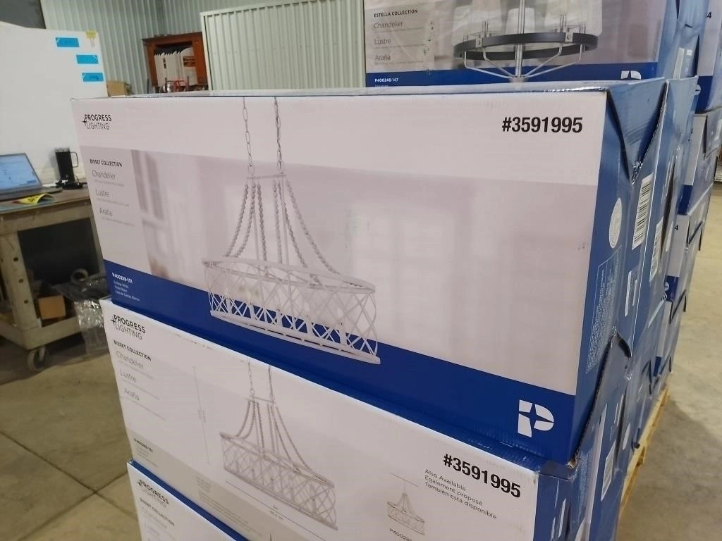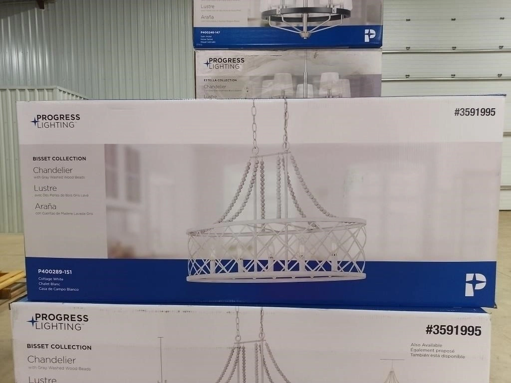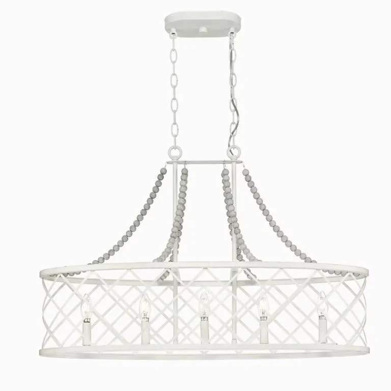 A decorative chandelier with a white finish. Features a chain for hanging and wooden bead accents. Perfect for adding a touch of elegance to your space.