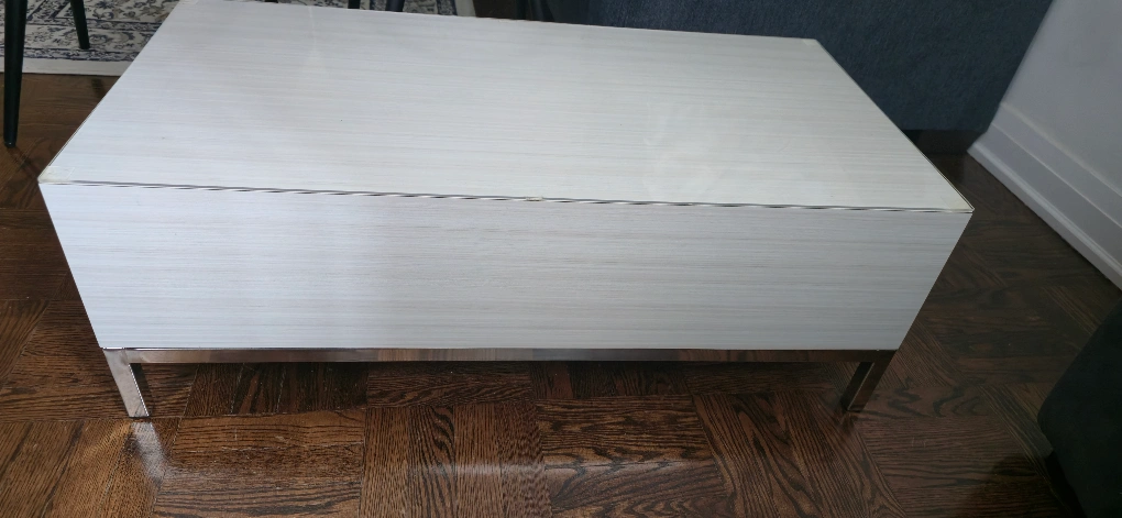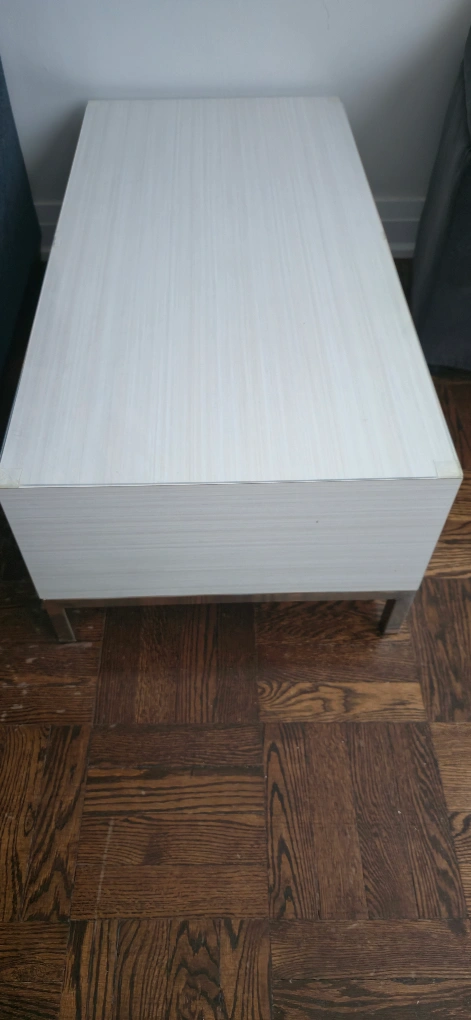 Selling a coffee table with a clean, white finish and sleek metal legs. It's in great shape and would look fantastic in any living room. Perfect for your morning coffee or displaying your favourite books and decor!