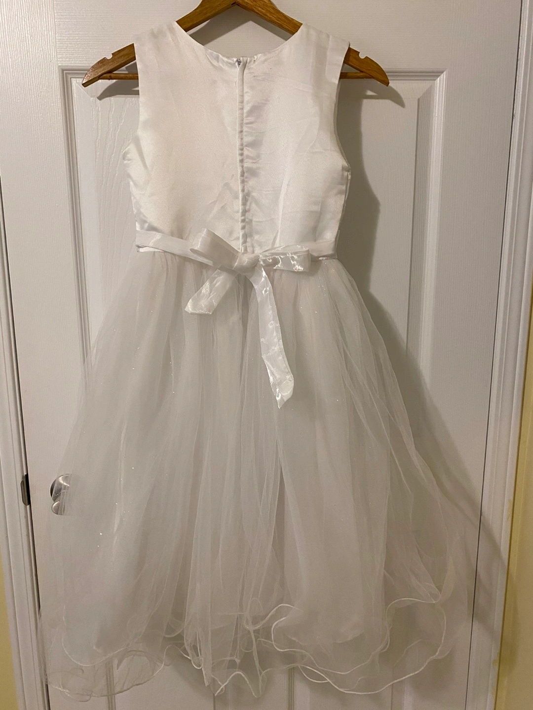 A beautiful white dress, perfect for a first communion girl or any special occasion! It features a lovely floral design on the bodice and a layered tulle skirt. The dress is in great condition and ready for its next event