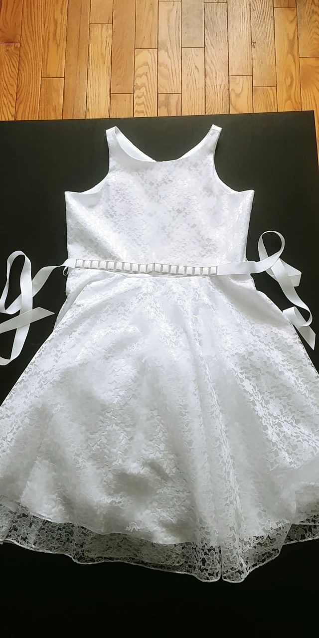 Beautiful dress, new condition. Size 14 can be for 12 year old girl. Bottom has various layers. Length mid-calf. Zipper on the back. IMPECABLE. Worn only to church.