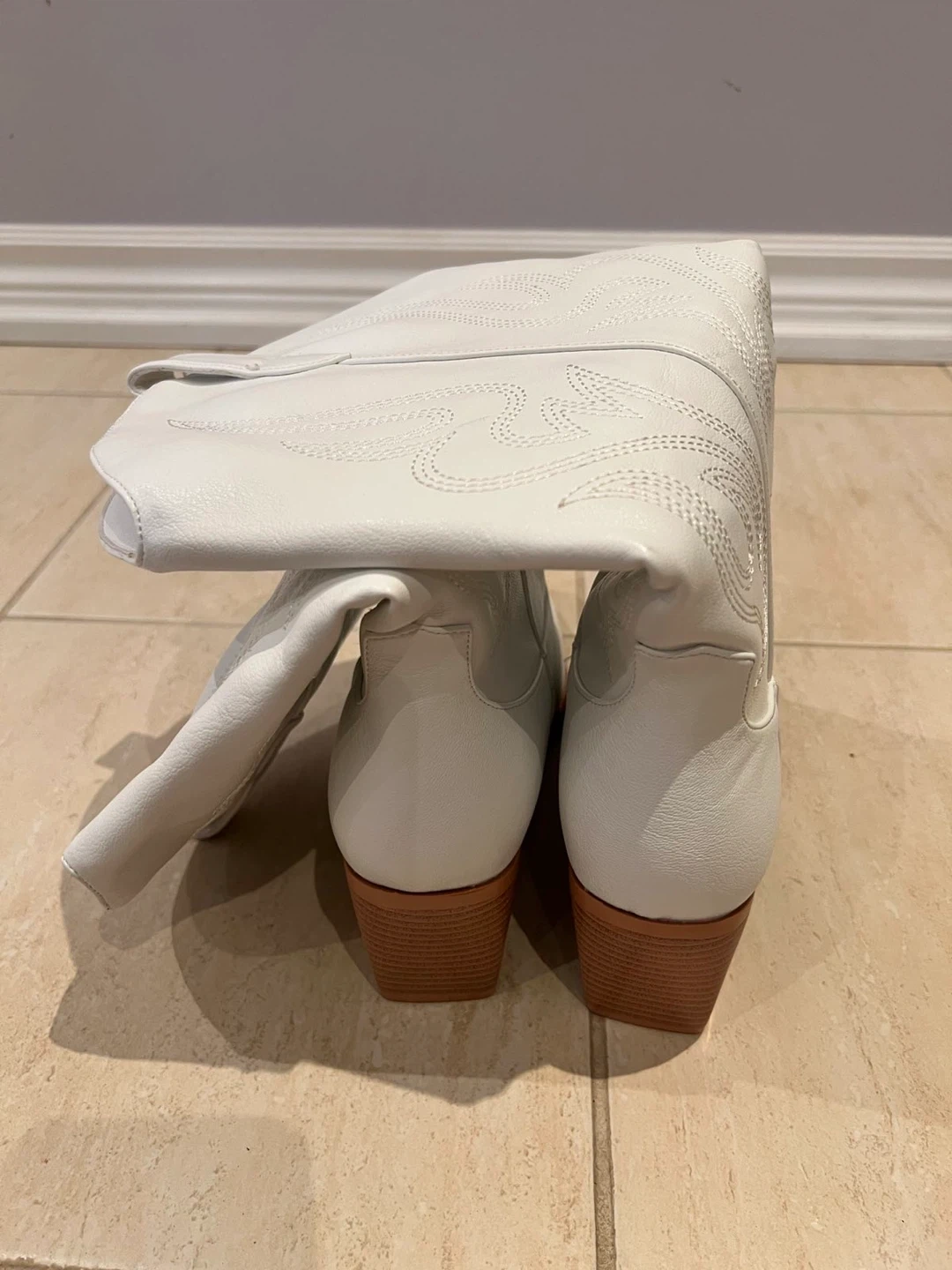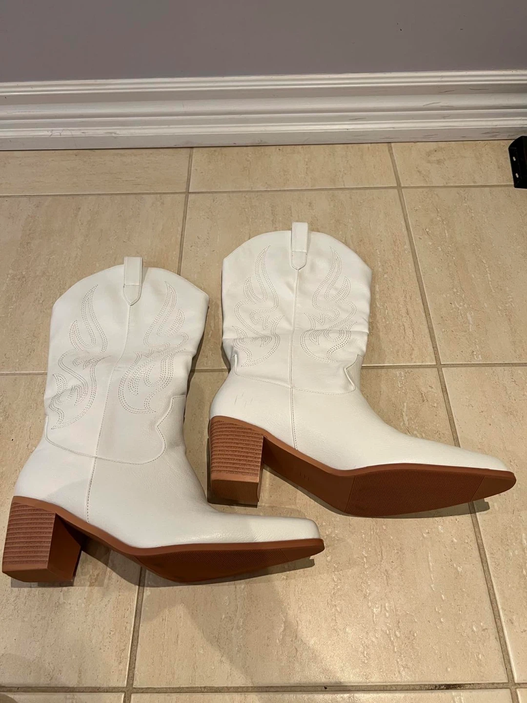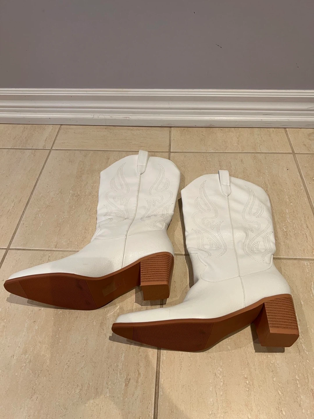 These white cowboy boots are in great condition and ready for a new home! They feature a stylish design and a comfortable heel. Perfect for adding a touch of western flair to any outfit