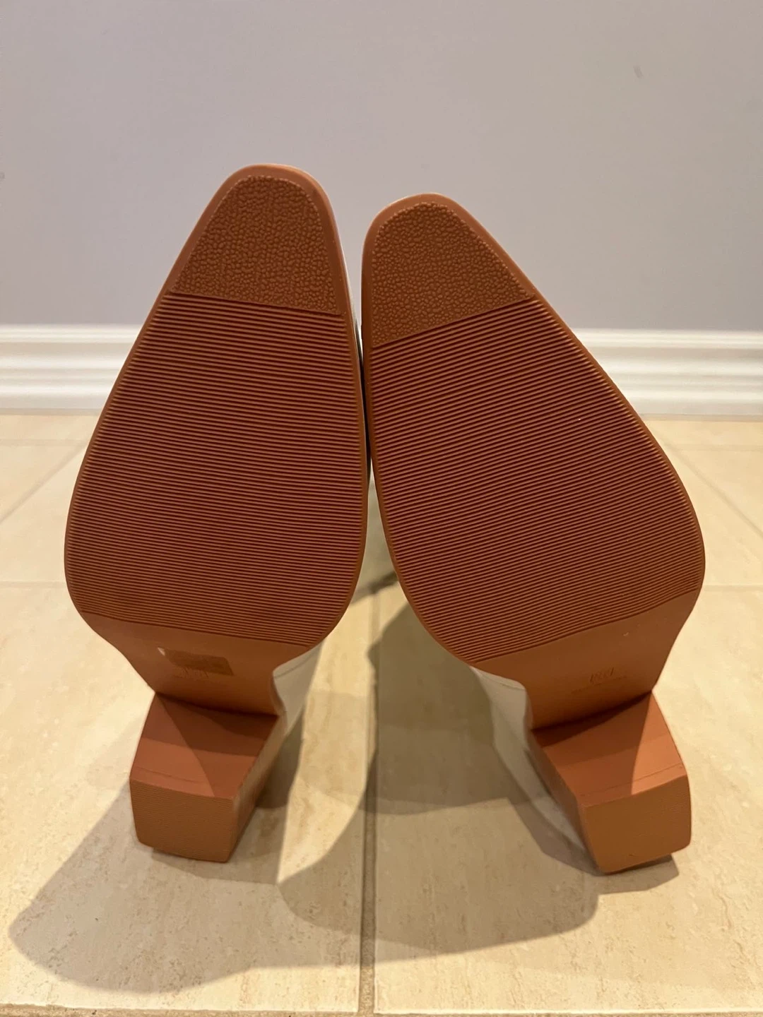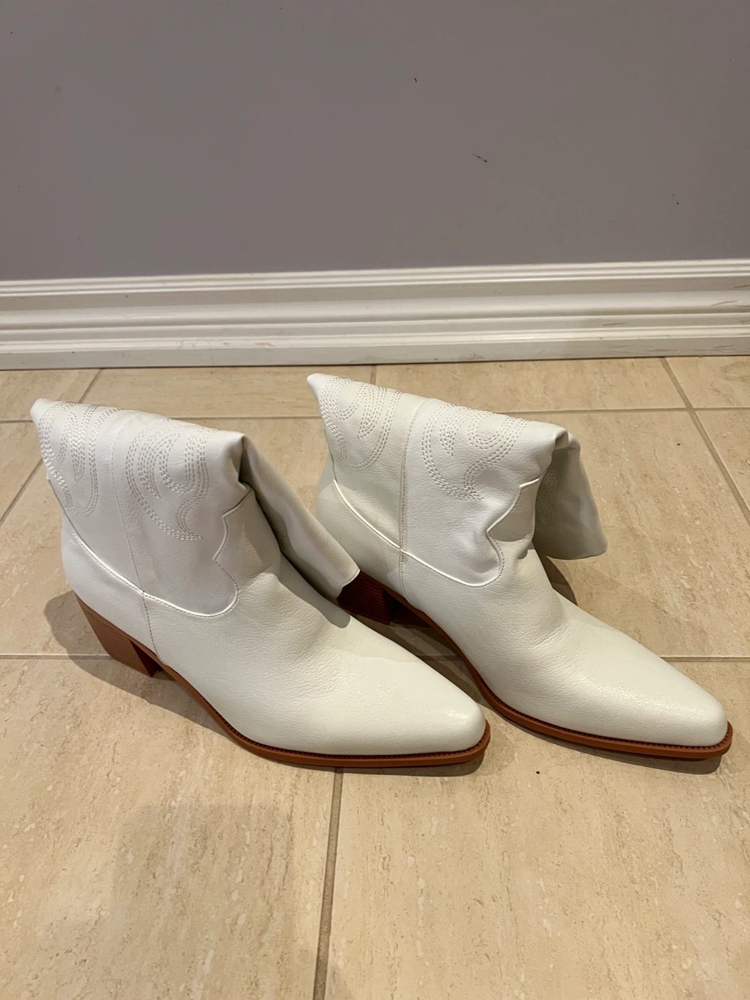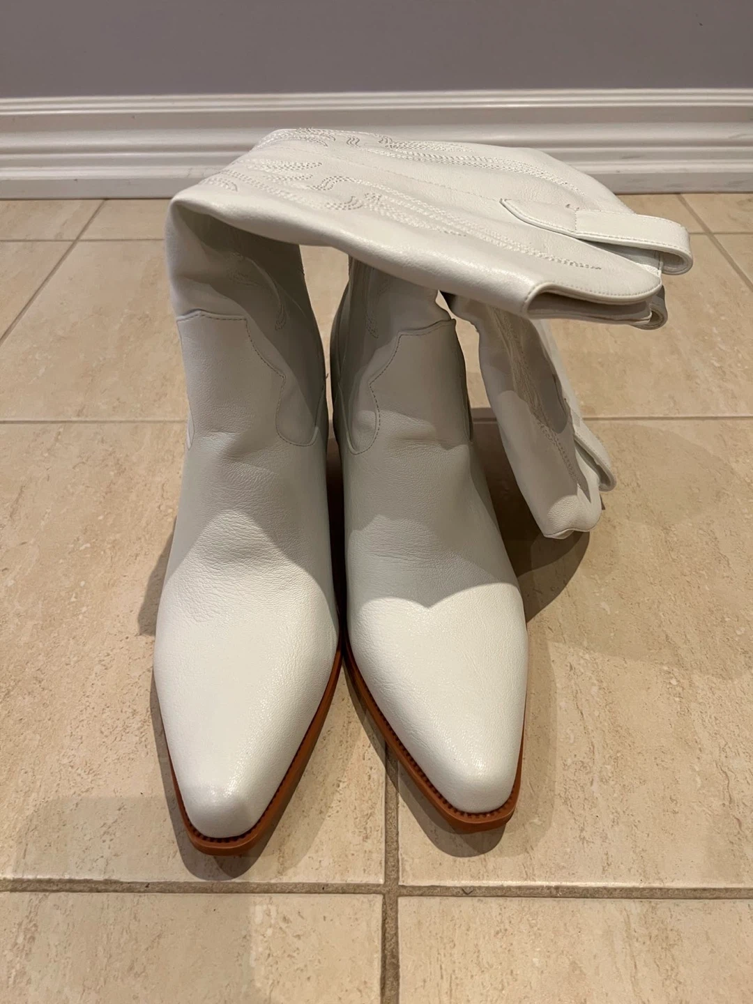 These white cowboy boots are in great condition and ready for a new home! They feature a stylish design and a comfortable heel. Perfect for adding a touch of western flair to any outfit