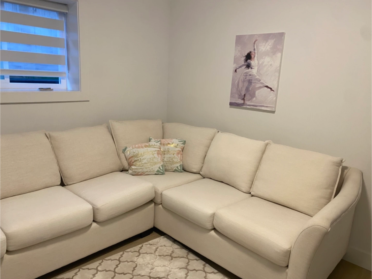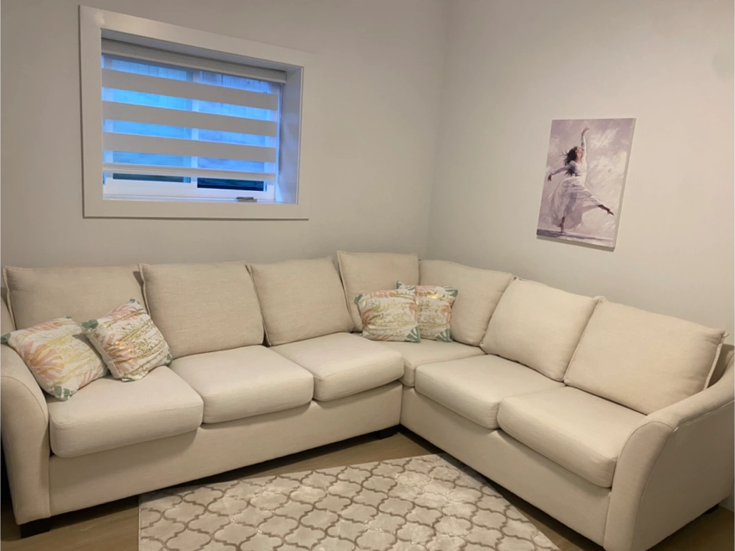 Selling a comfy sectional sofa in a white/cream colour. It's in good condition and would be a great addition to any living room or den. All cushions have removable and washable covers.The cushions are soft and supportive, perfect for lounging! Need to b gone with in this week since moving dont have space for it . Comes with decorative pillows.