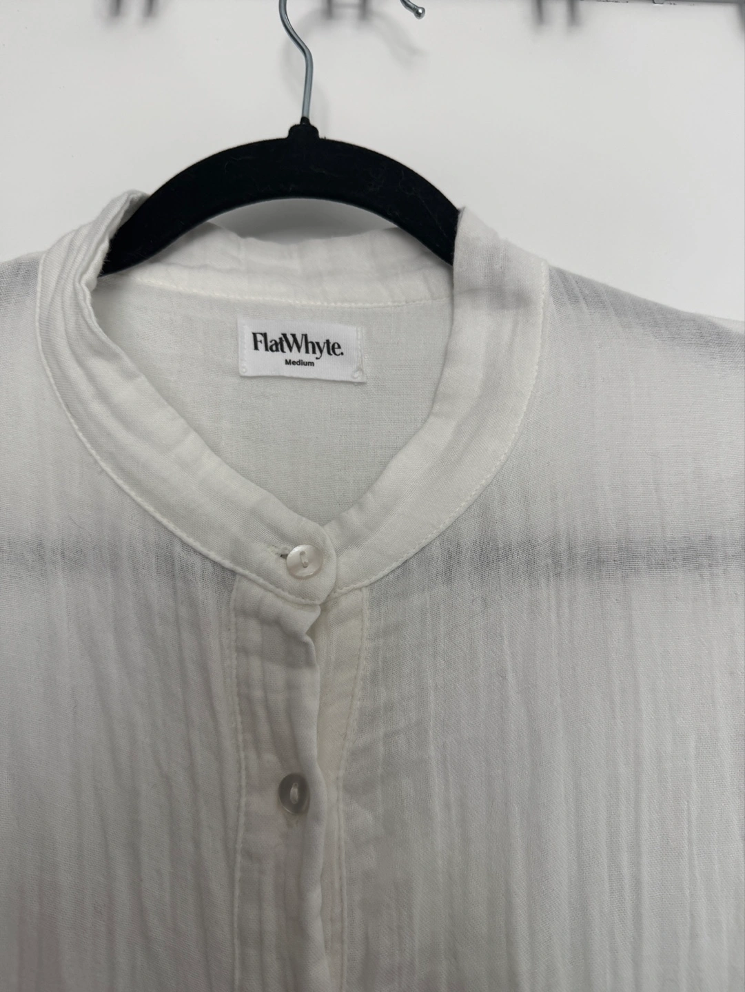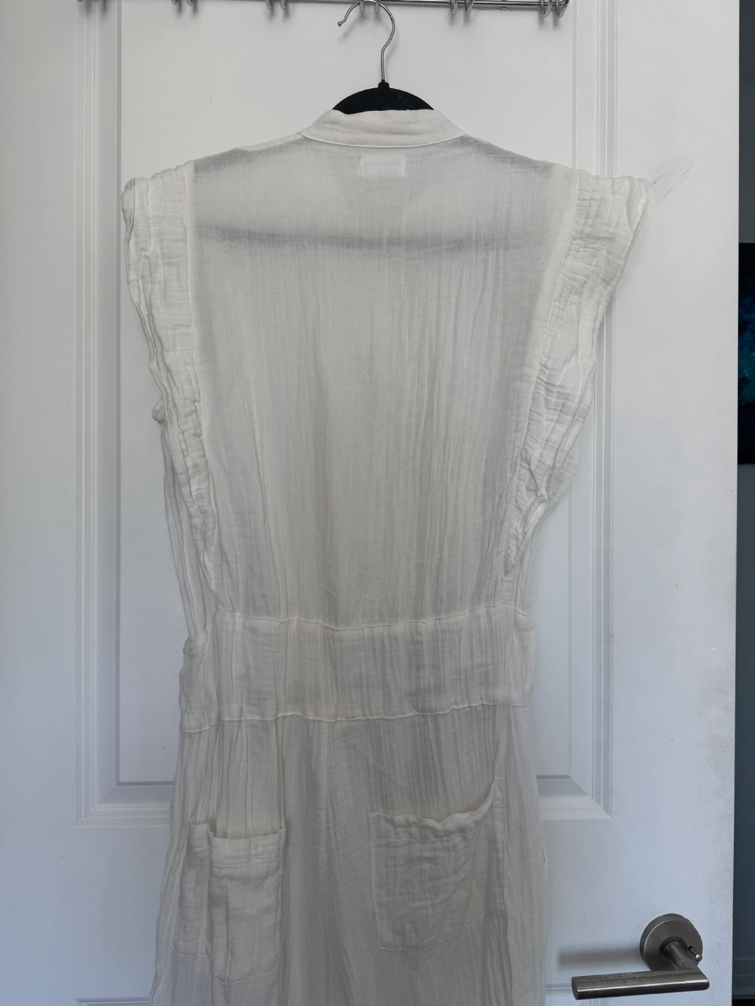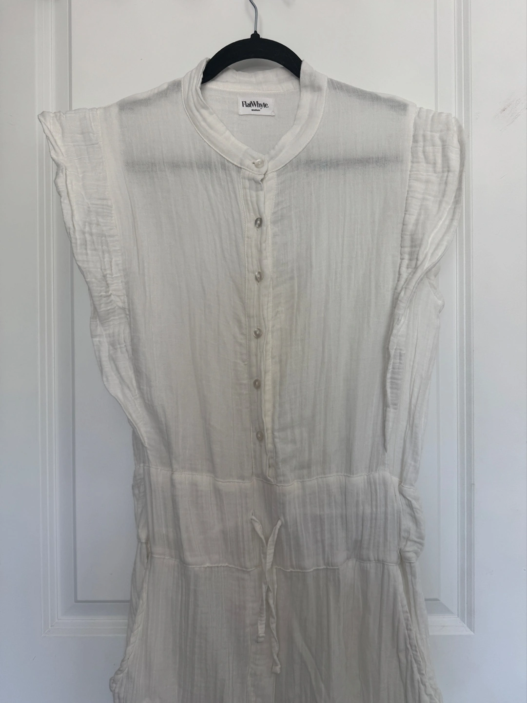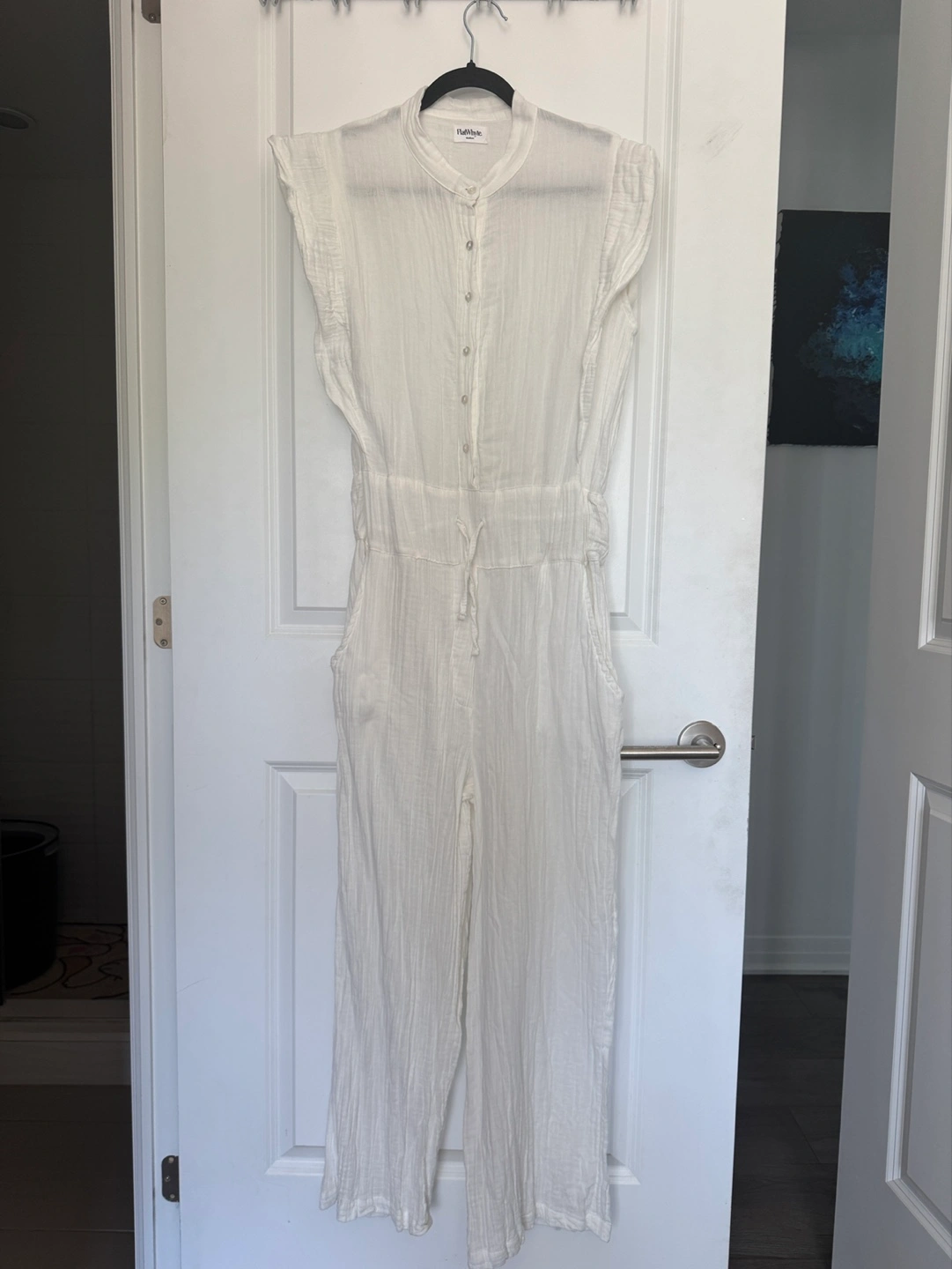 White crinkled cotton jumpsuit, 100% cotton, from a local designer. Features button closure, ruffle sleeves, and pockets. Wide-leg style. Size medium - would also fit small since waistband portion is relatively tight. Only worn once. Pickup near Woodbine Station only. First come first serve.