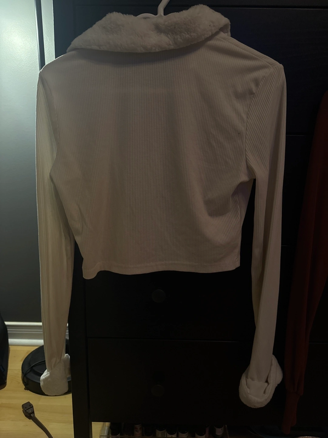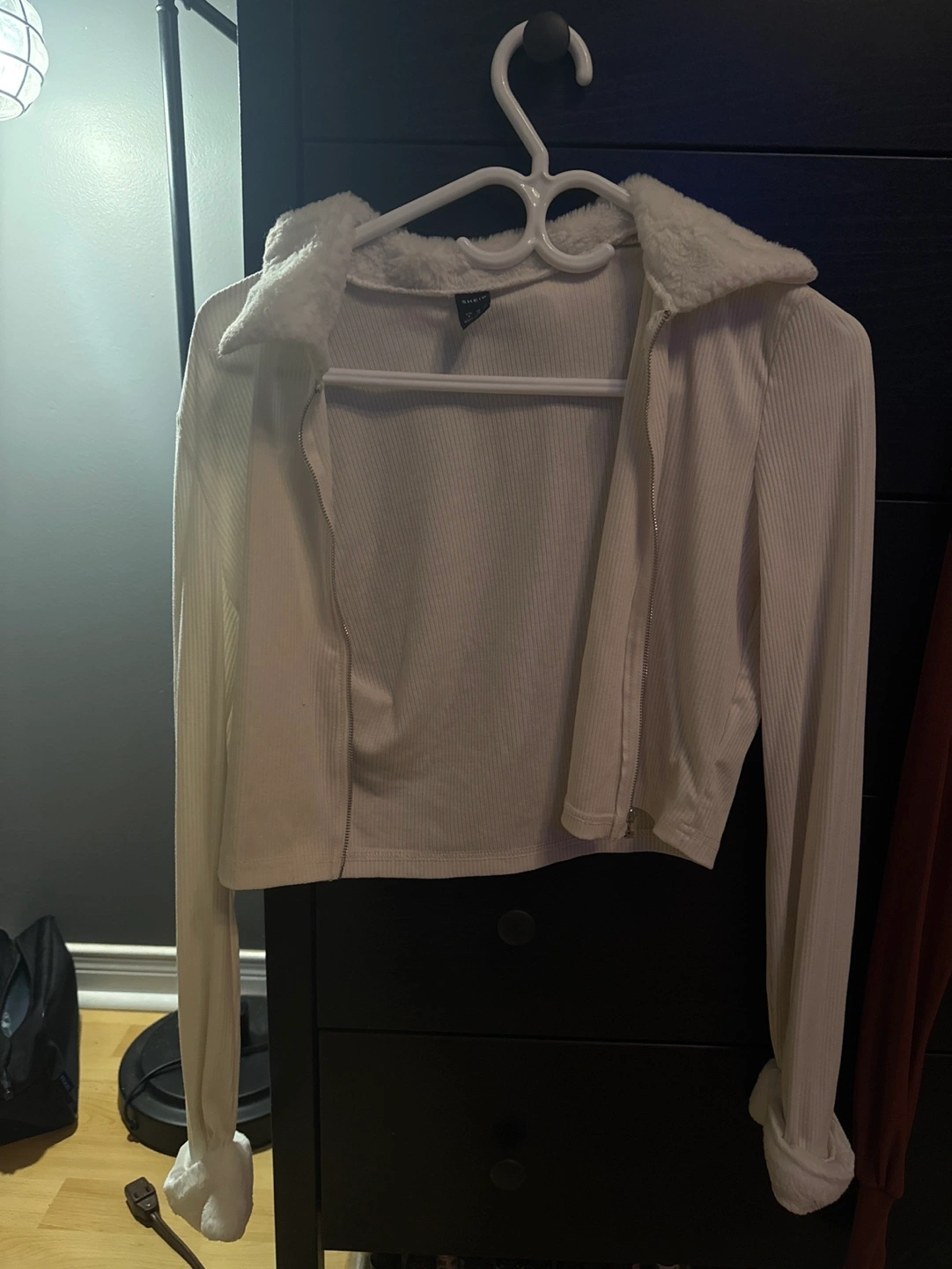 Show allWomen's cropped zip-up jacket. Features long sleeves, ribbed fabric, and a faux fur collar and cuffs. White colour.