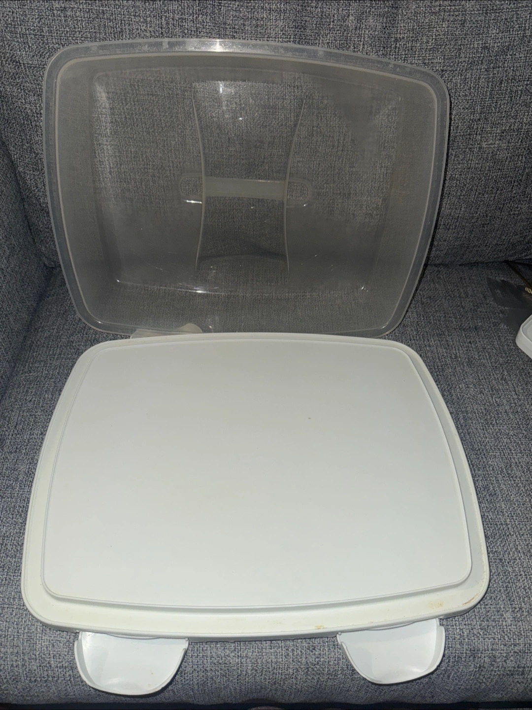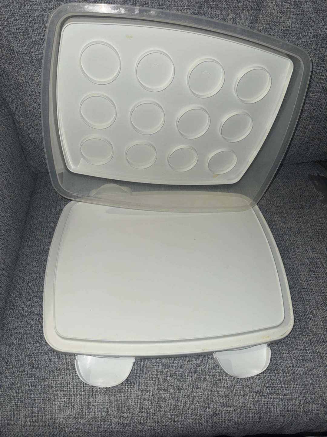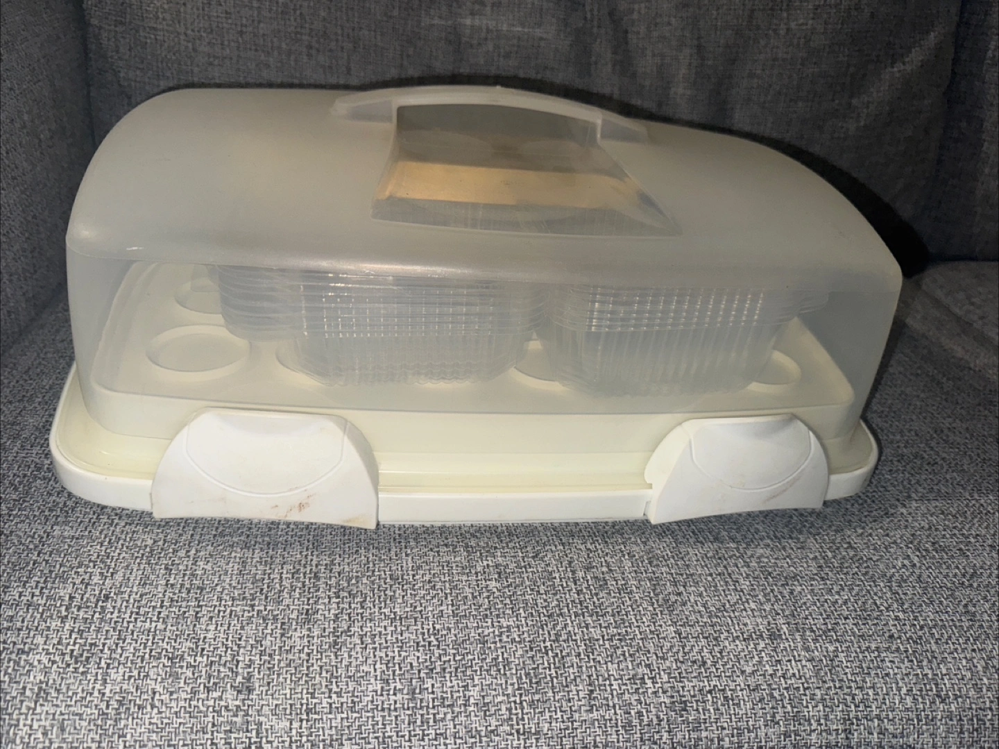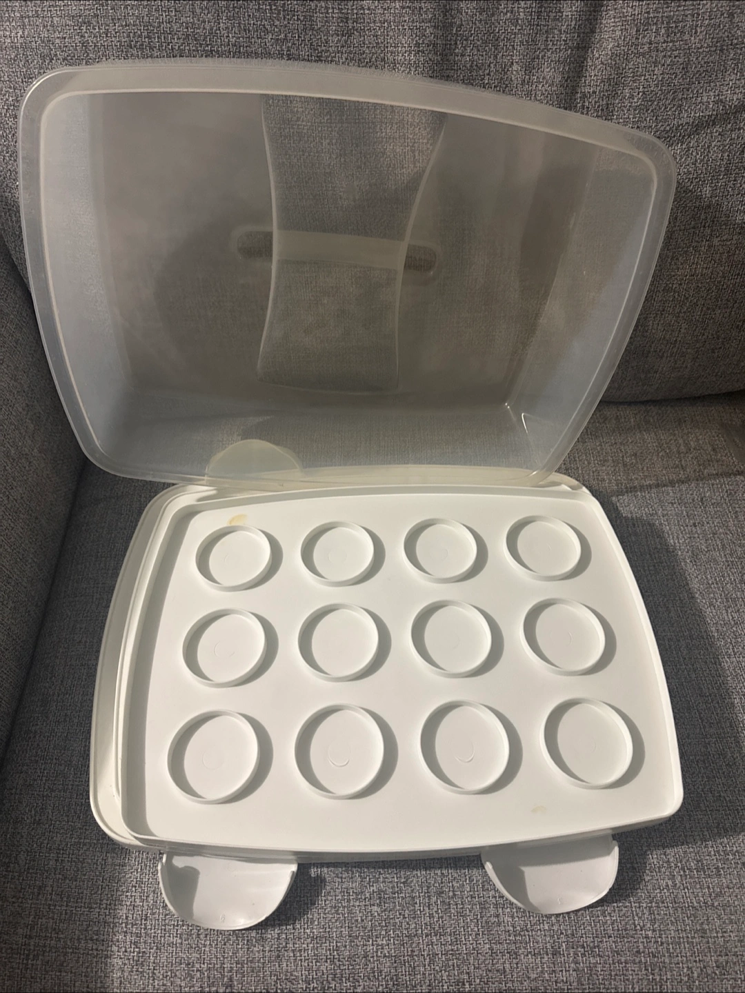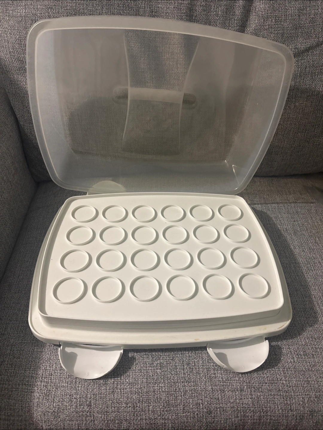 This is a white cupcake carrier and storage container. It has a clear lid and a base with two handles. The insert has spaces for individual cupcakes or muffins. Perfect for transporting your baked goods to parties or gatherings!