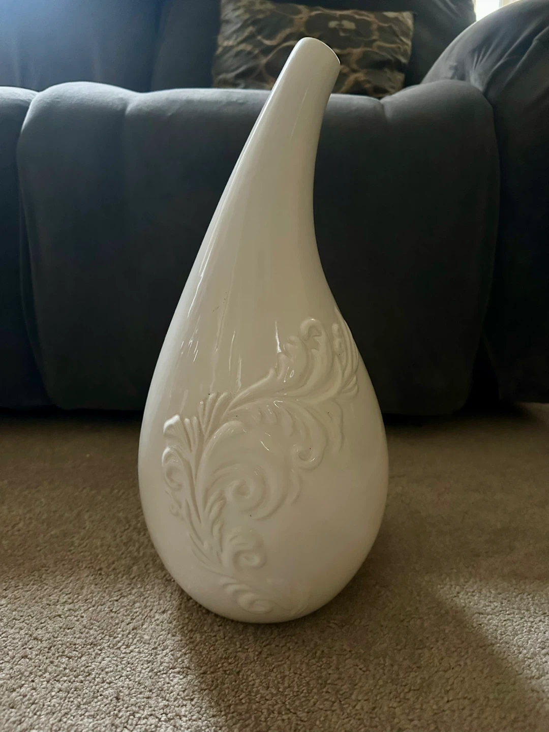 A lovely white glass vase, perfect for adding a touch of elegance to any room. It features a beautiful floral design. It's in great shape and ready for a new home!