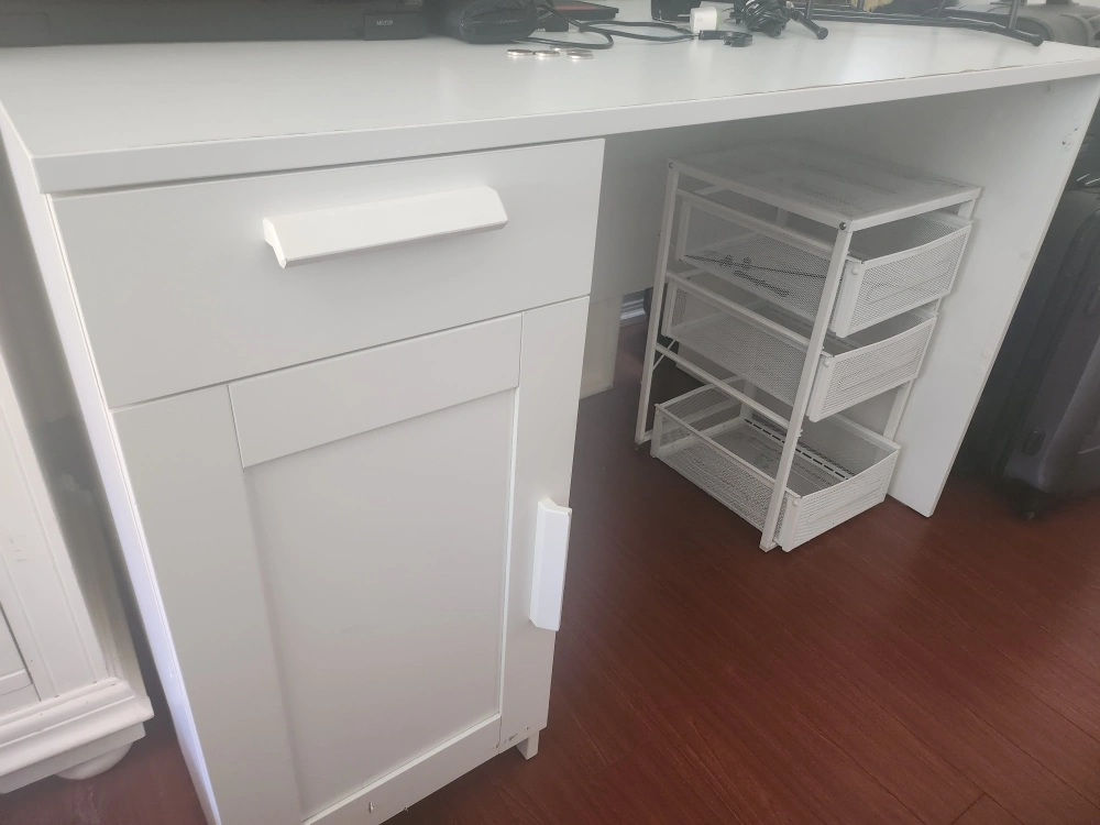 Selling a white desk that comes with a drawer and a separate shelf unit. It's in great shape and would be perfect for a home office or study space. The clean, simple design fits well with any decor!