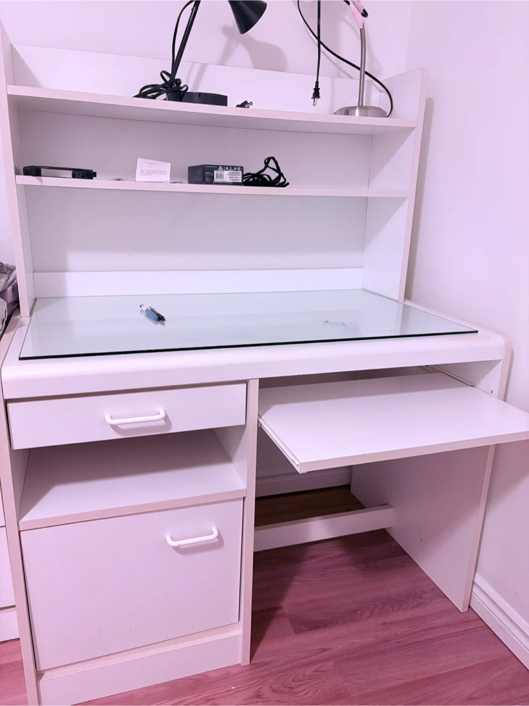 Selling a white desk with a hutch and a glass top. It features drawers and a slide-out keyboard tray for convenience. A great addition to any home office or study space! Pick up in Markham