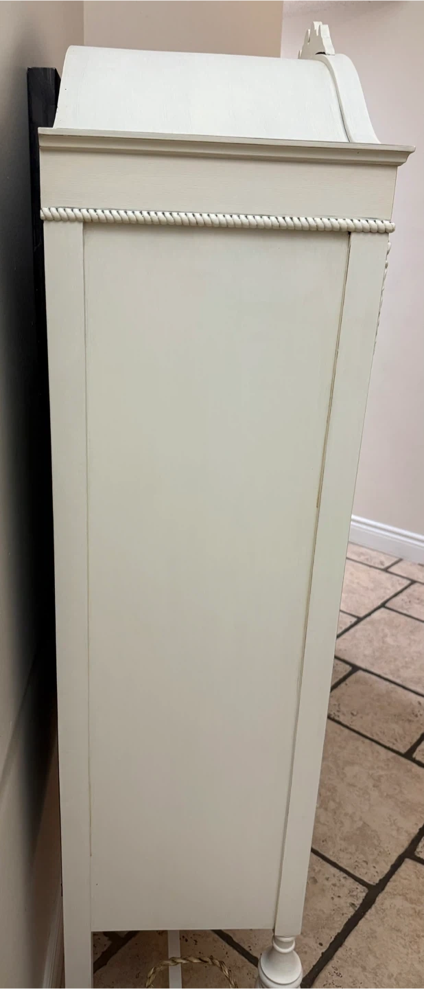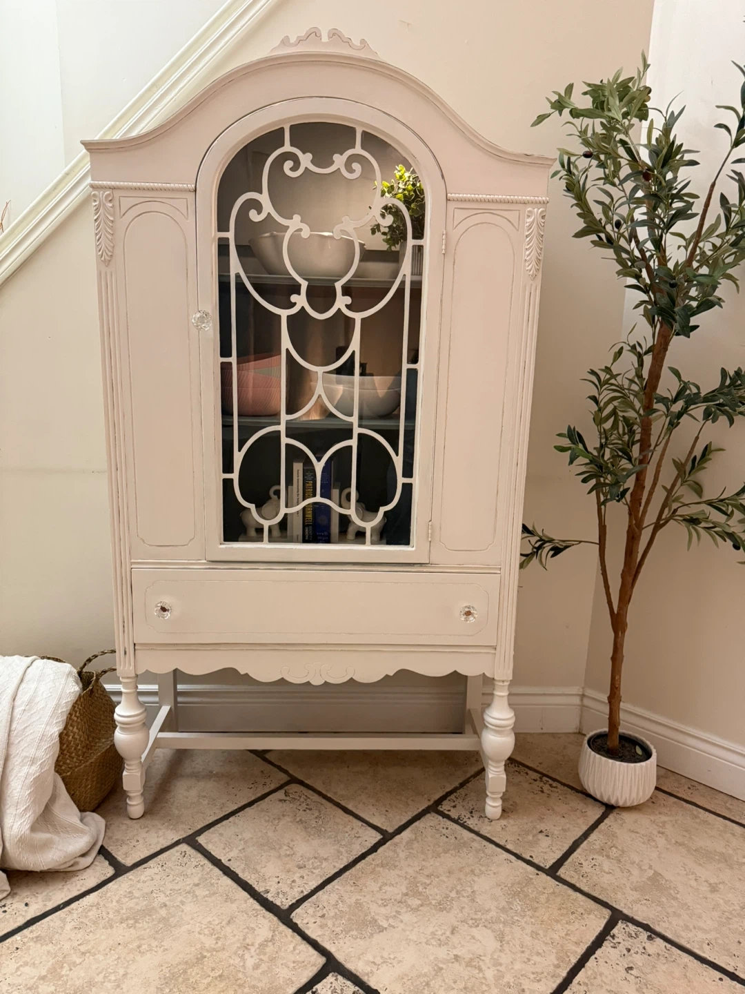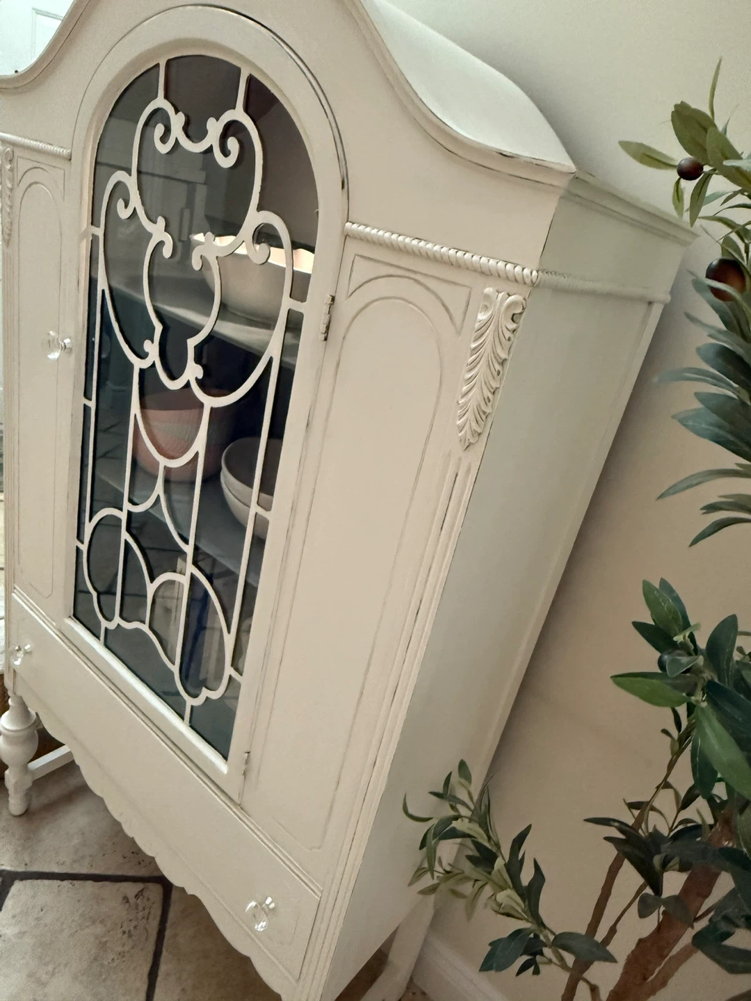 Lovely white display cabinet. It features a glass door with decorative trim and a drawer at the bottom for extra storage. The interior is painted a soft blue, adding a touch of colour. It's perfect for showcasing your favourite items! Delivery available for a small fee L 67” W 37” D 16” Check out my other listings