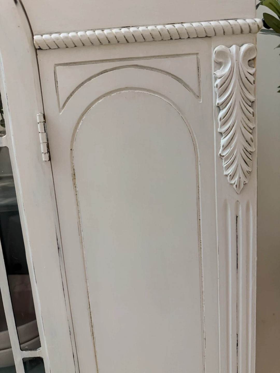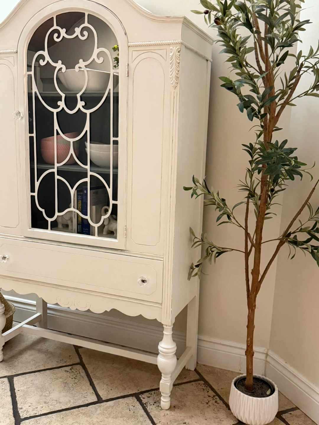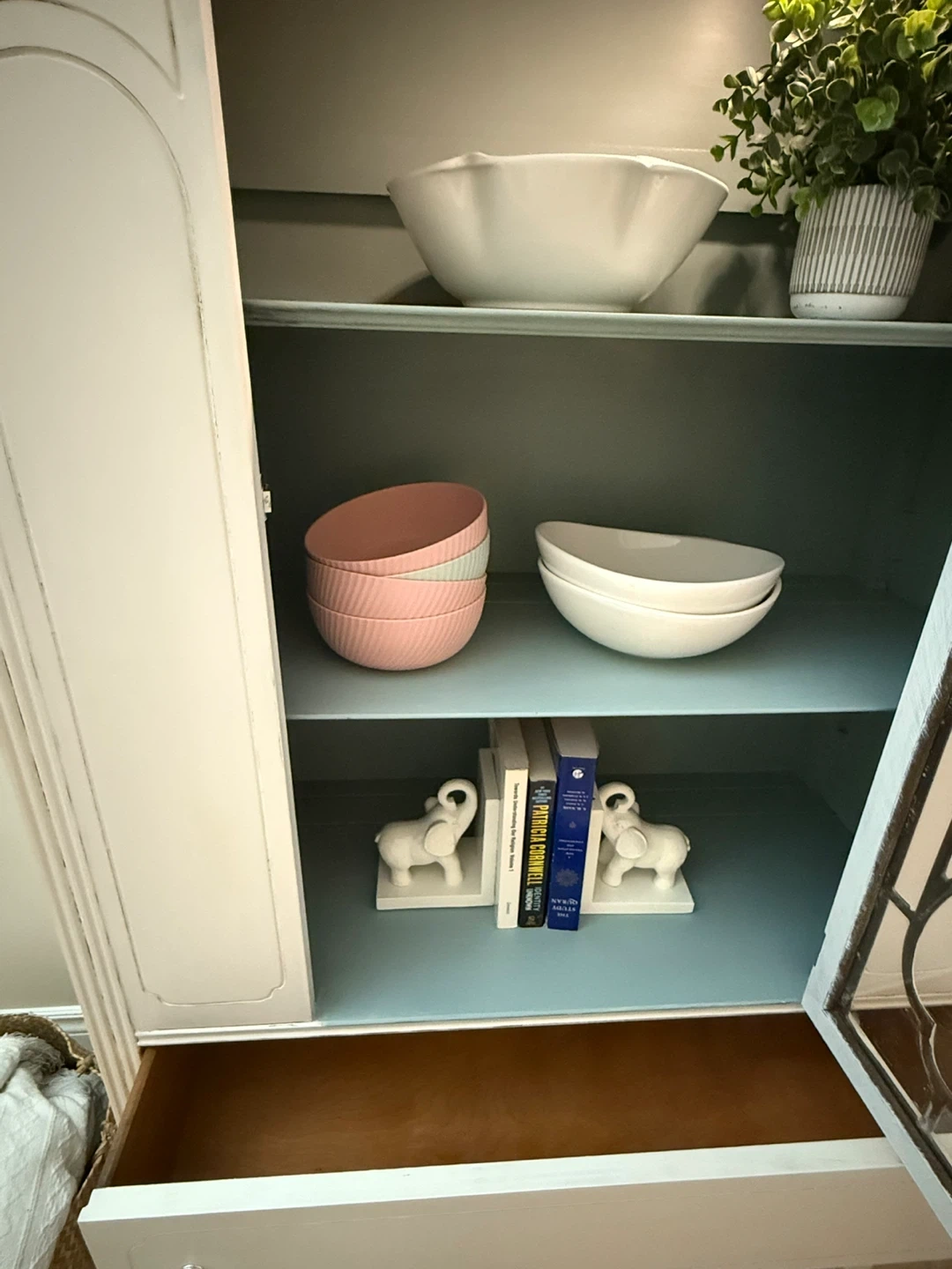 Lovely white display cabinet. It features a glass door with decorative trim and a drawer at the bottom for extra storage. The interior is painted a soft blue, adding a touch of colour. It's perfect for showcasing your favourite items! Delivery available for a small fee L 67” W 37” D 16” Check out my other listings