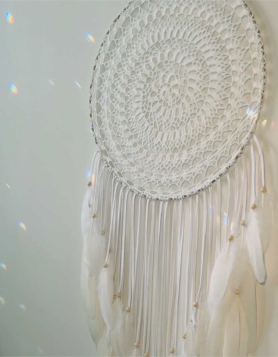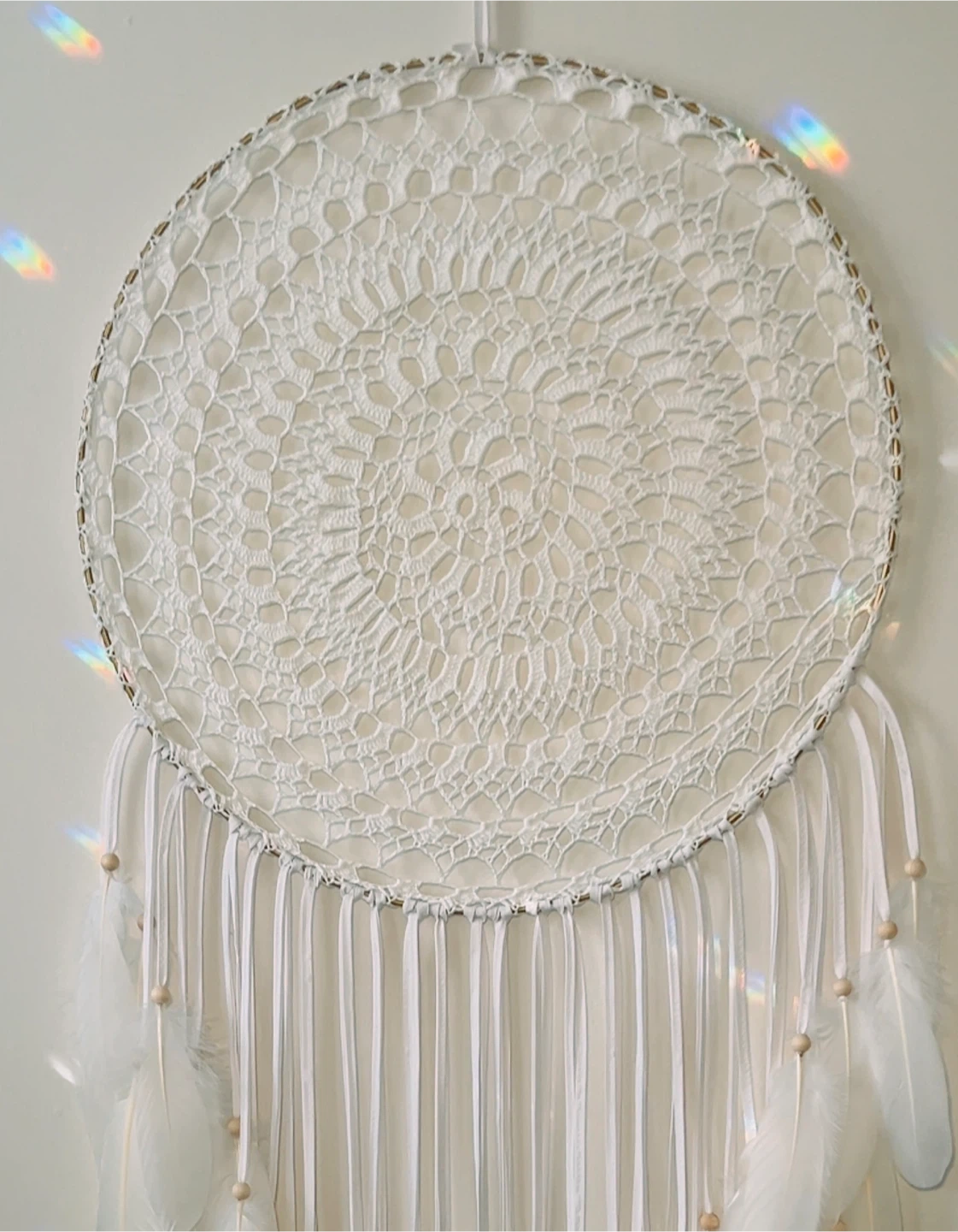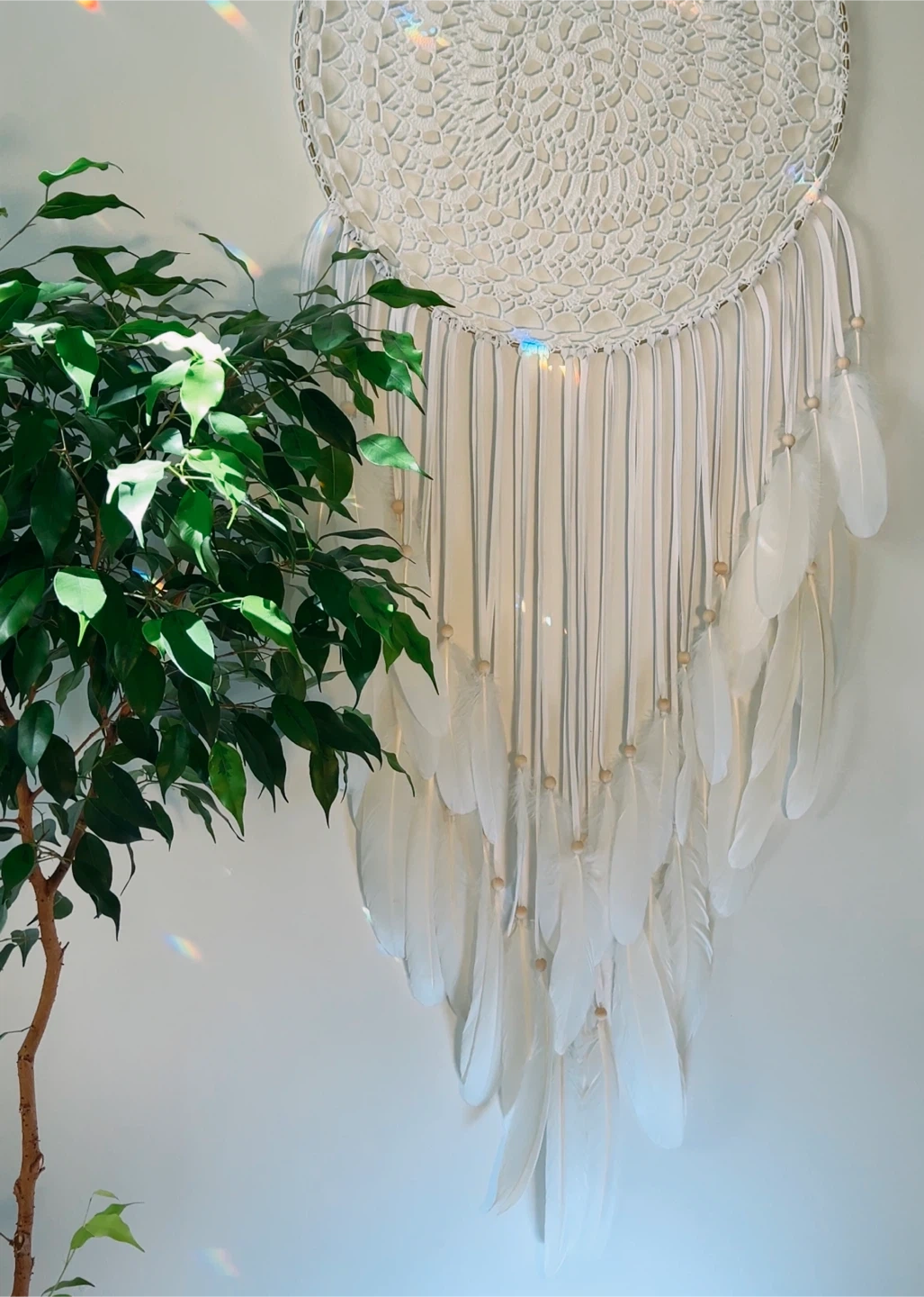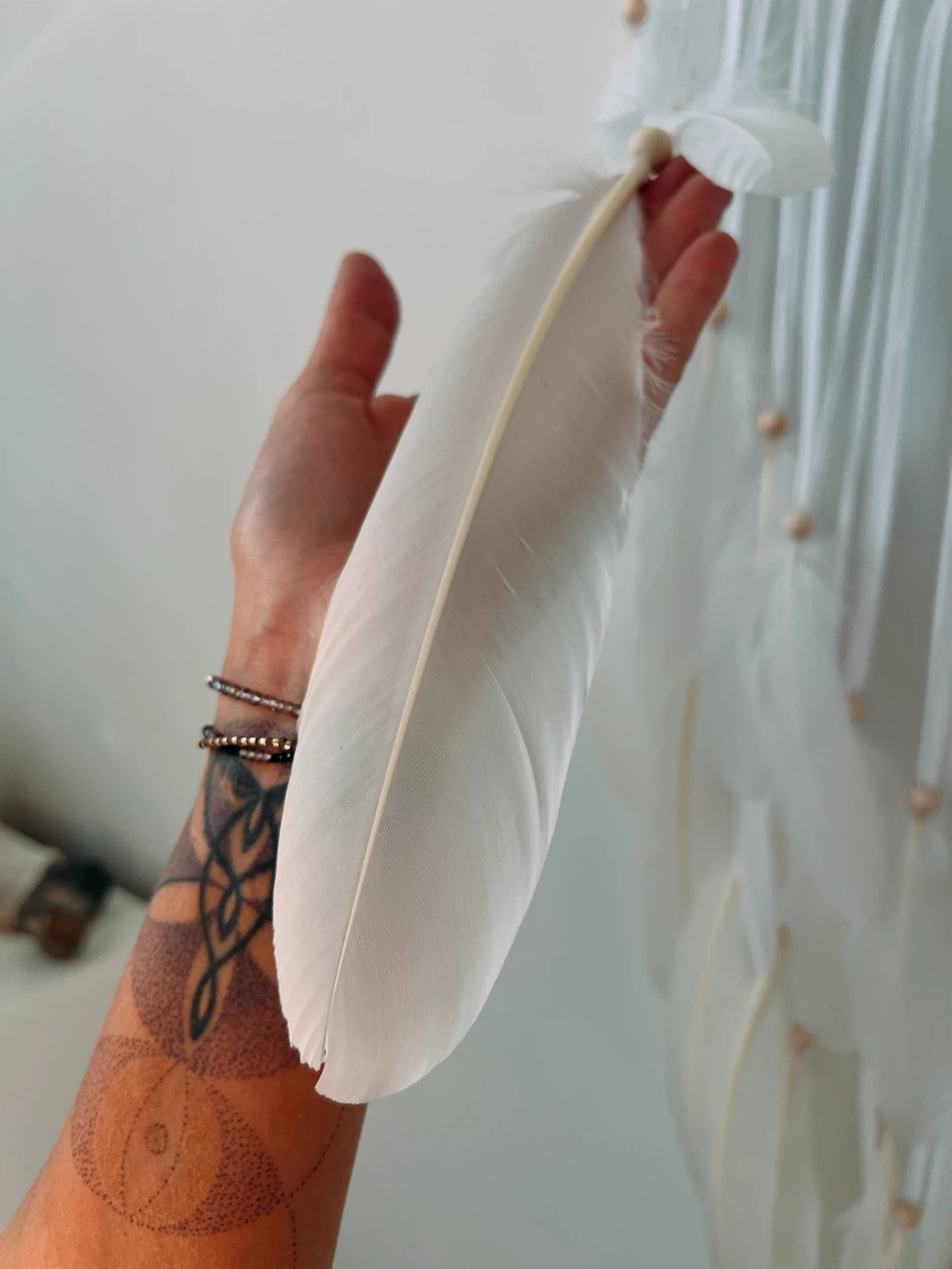 🪽Handmade Dreamcatcher ✨ The crochet centerpiece was carefully crafted, and the feathers were collected along Lake Ontario. They are natural swan feathers, gathered with gratitude each morning, then washed and dried. In return, I gave back to nature by collecting litter from the lake - making this a cruelty-free and conscious creation 🙏🏼 ✨ Diameter: 48 cm ✨ Total length: 130 cm More than just boho-style décor, this dreamcatcher carries positive energy and a minimalist beauty that will bring harmony and uplifting vibrations into your space 🤍 Pick up Dundas and Broadview