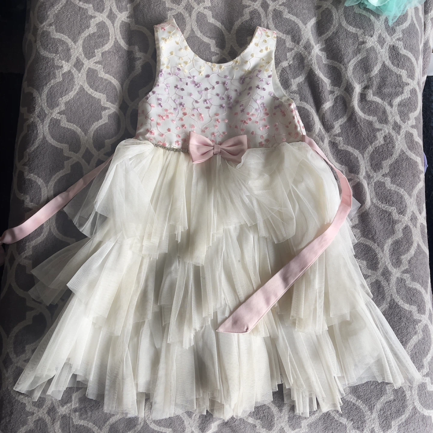 White Dress with Pink Bow A lovely white dress with a pink bow accent! It features a tiered skirt and delicate floral embroidery on the bodice. Perfect for special occasions or dressing up! Size 6-6x Pick up in new Westminster bc Firm price!