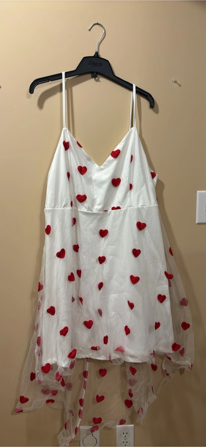 Here's a cute white dress with red hearts! It features a v-neck and a mesh overlay with heart detailing. Perfect for a fun night out or a special occasion