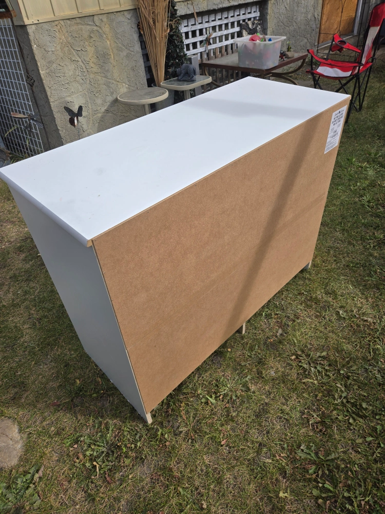 I'm selling a white dresser that's perfect for a kids' room or any space needing extra storage! It features four drawers with cute pink button knobs and open shelving on top for displaying books or toys. It's in great condition and ready for a new home
