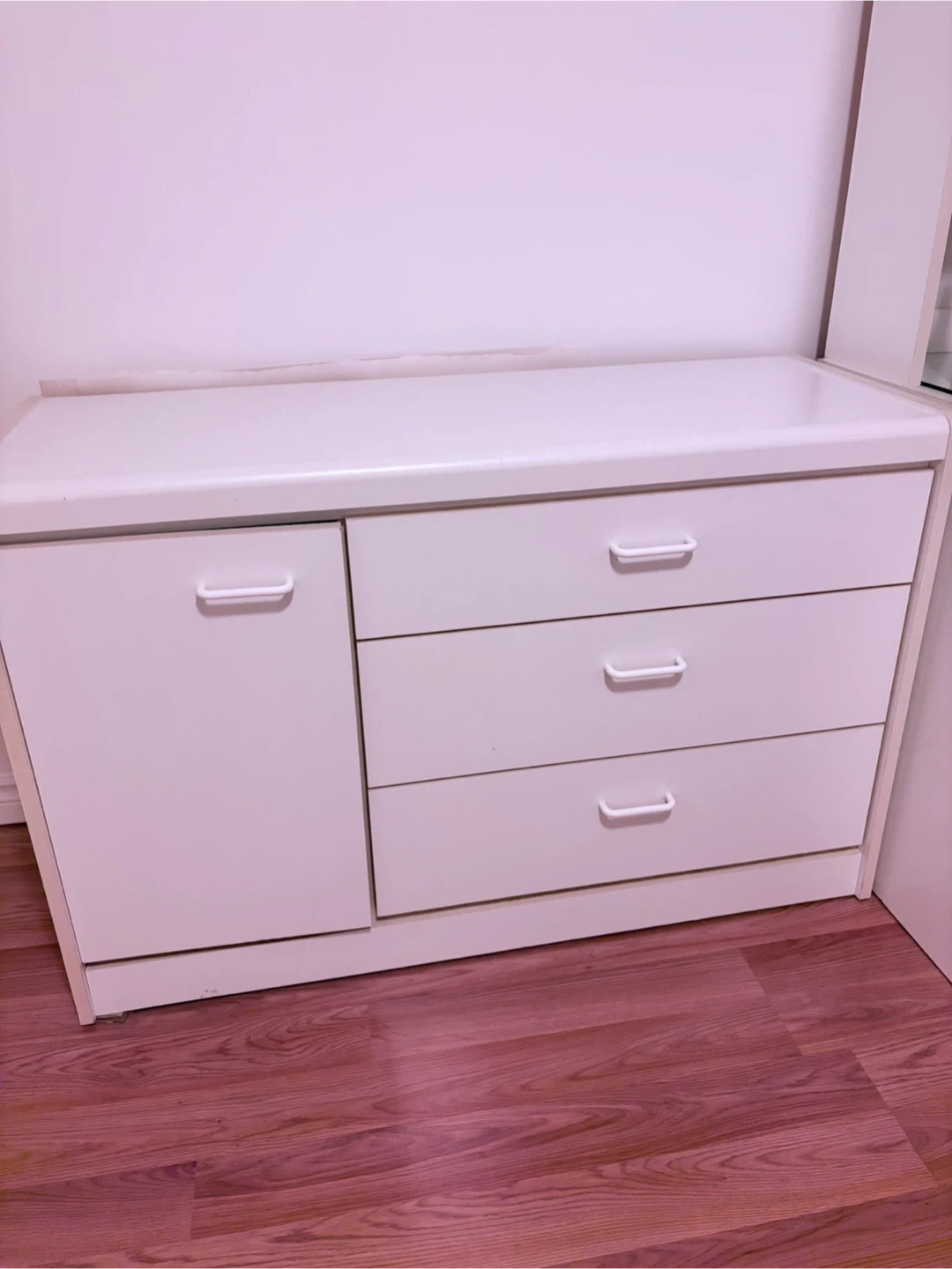 Selling a dresser in great condition! It's white and features three drawers and a cabinet on the side. Perfect for adding storage to any room