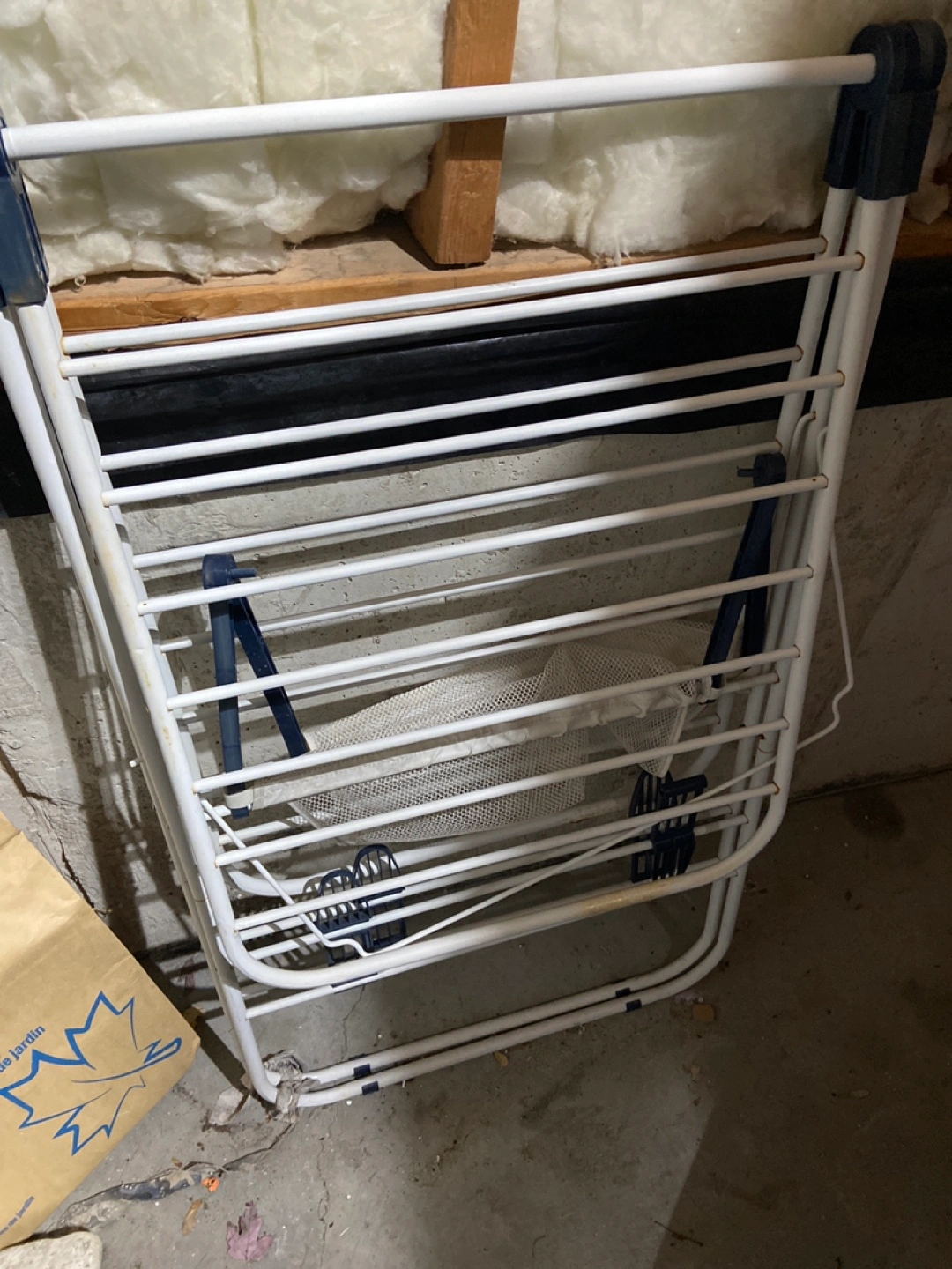 White drying rack. Made of metal, with a foldable design. Has a mesh compartment in the middle. You can use this to air dry your clothes without any hassle.also has drying rack for shoes