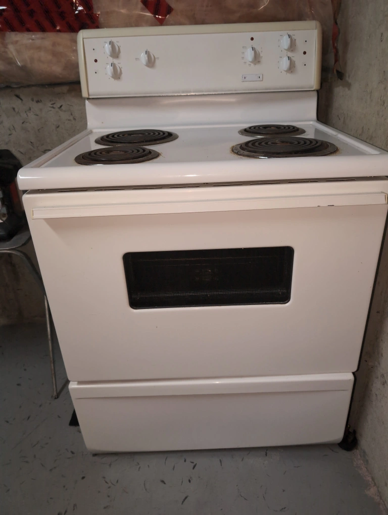 White electric stove with four burner stovetop and oven. Has a storage drawer below the oven.