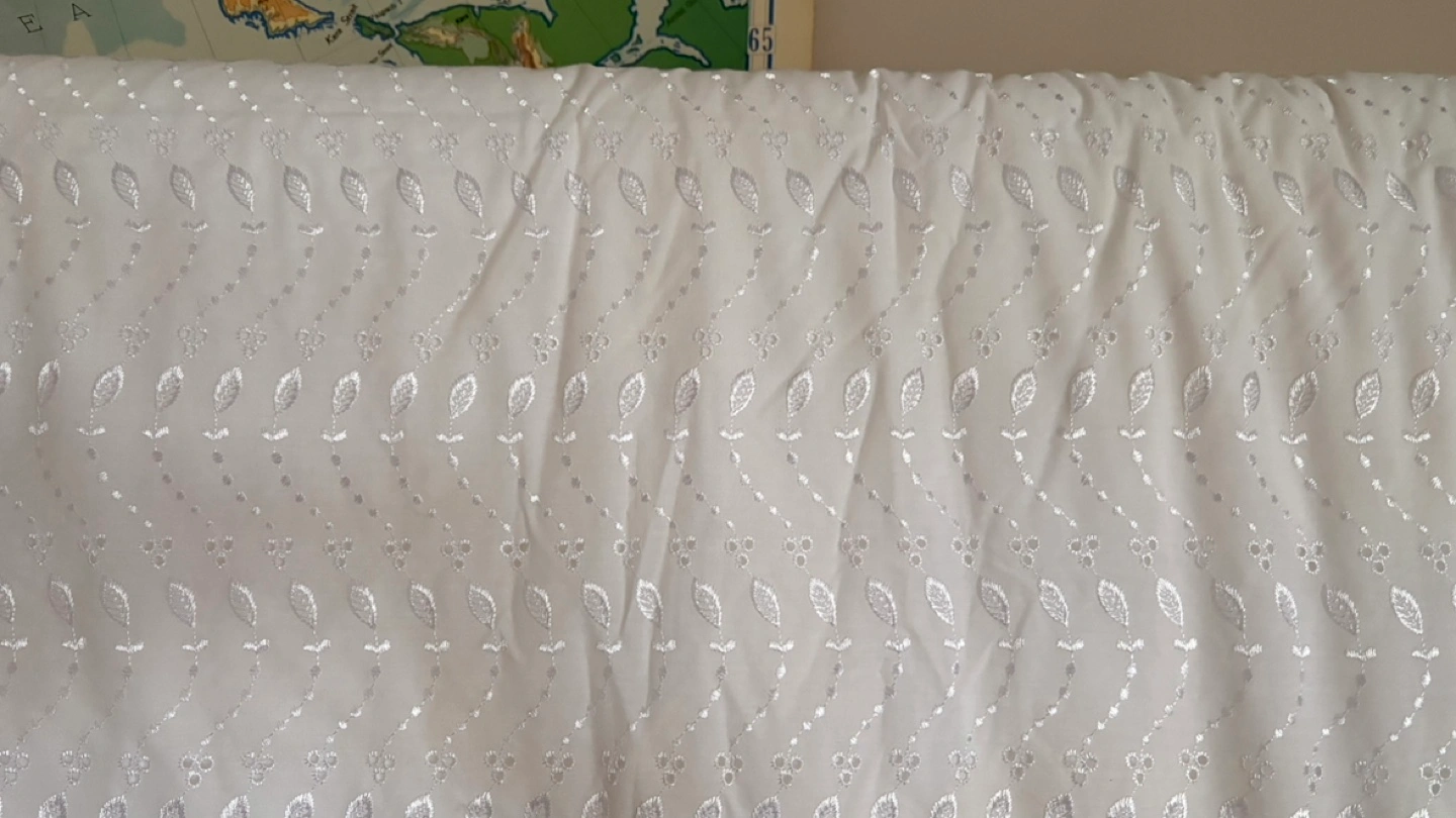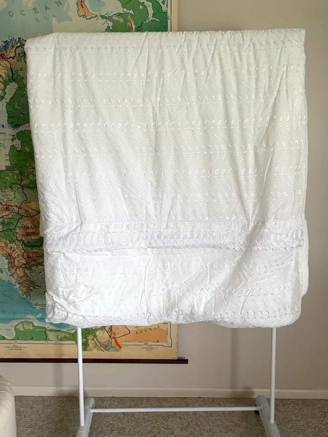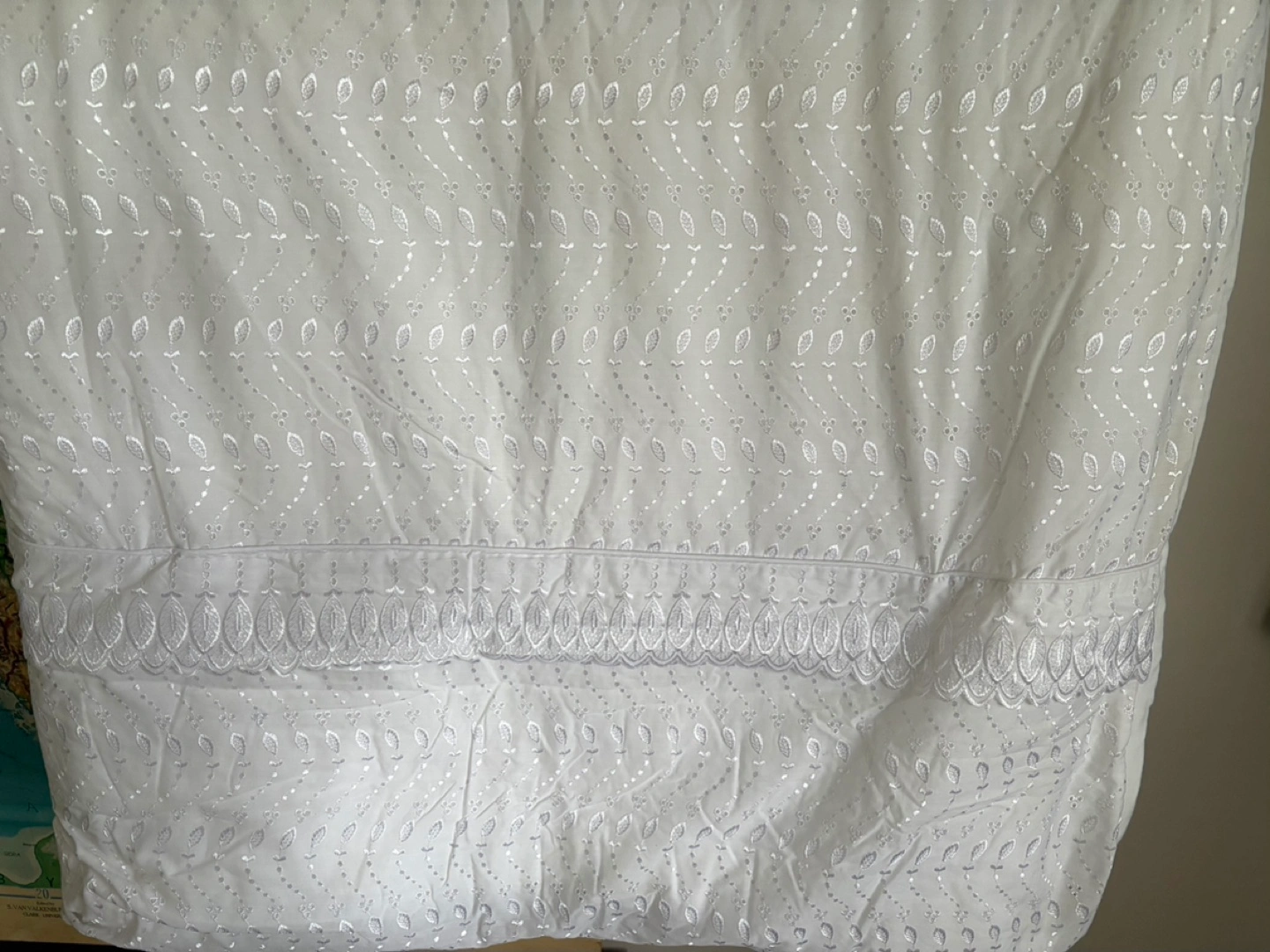Beautiful 50% cotton white duvet cover. Features an embroidered leaf pattern and a delicate lace trim. Looks lovely on a bed. Polyester Full Size comforter 70” x 80”