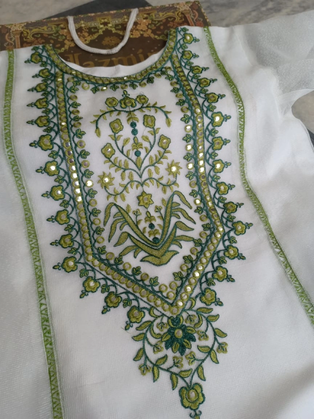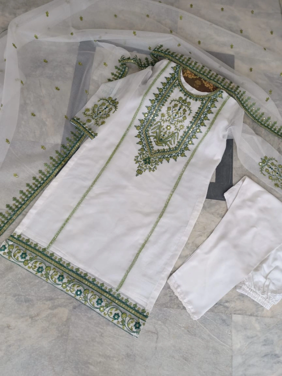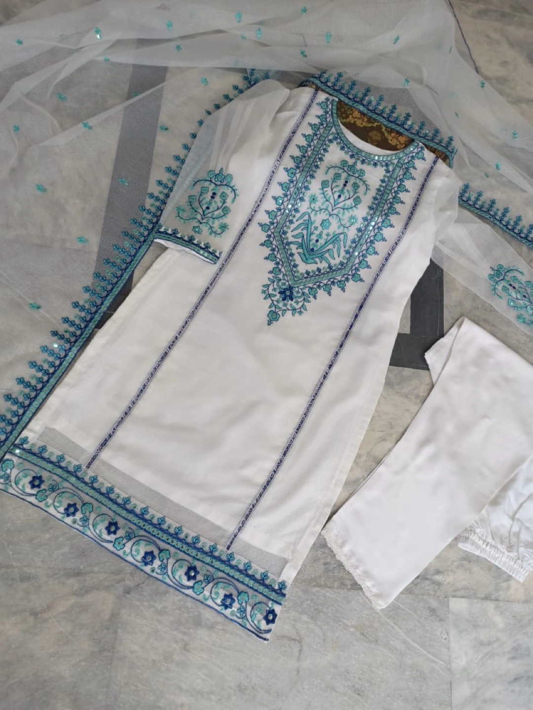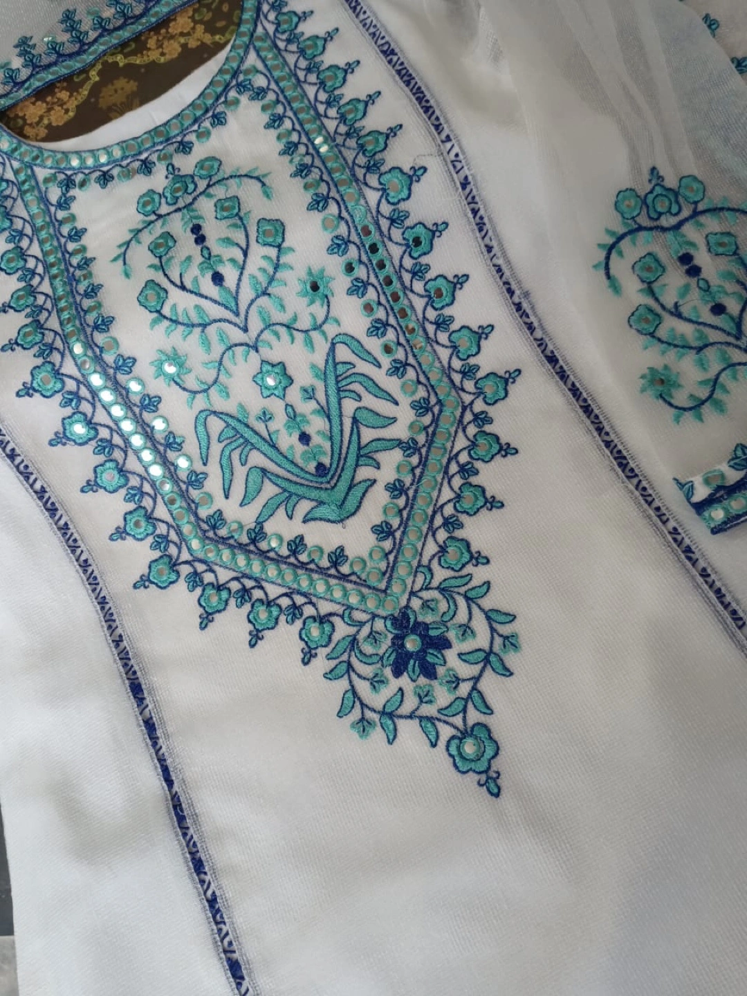 Beautiful white Pakistani shalwar kameez suit with intricate embroidery. It includes a shirt, pants, and a dupatta. The embroidery features floral and geometric designs in shades of blue and green. Perfect for a special occasion or everyday wear!