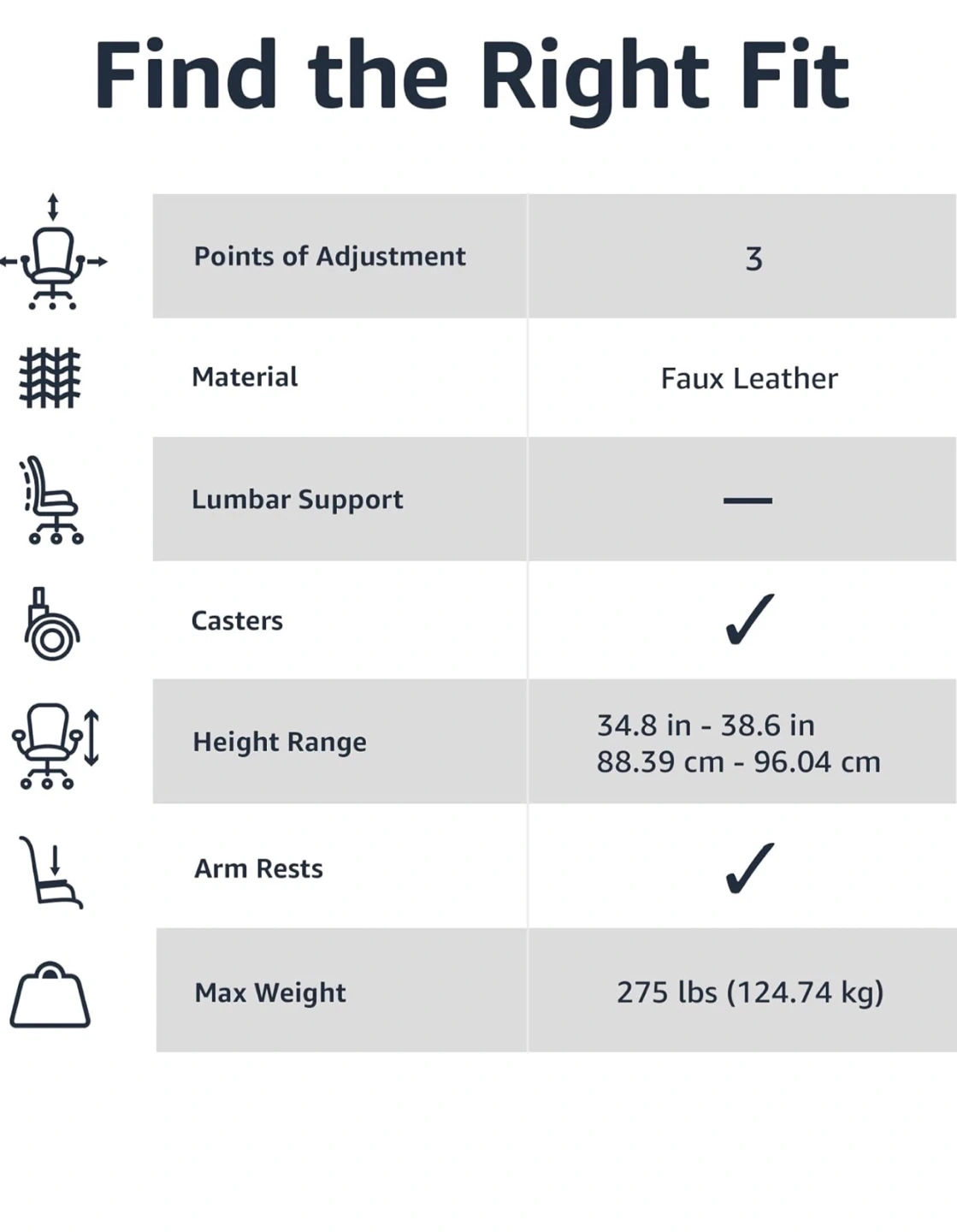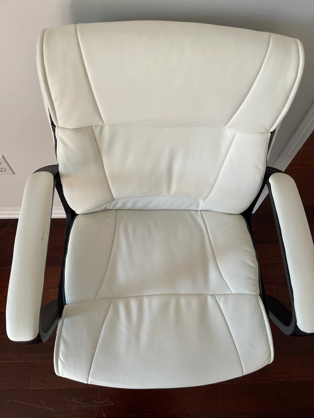 Selling a comfortable white office chair made of faux leather. It has a height range of 34.8 to 38.6 inches and can support a max weight of 275 lbs. It also has arm rests and casters! Amazon Product Link- https://a.co/d/dJIvF8y