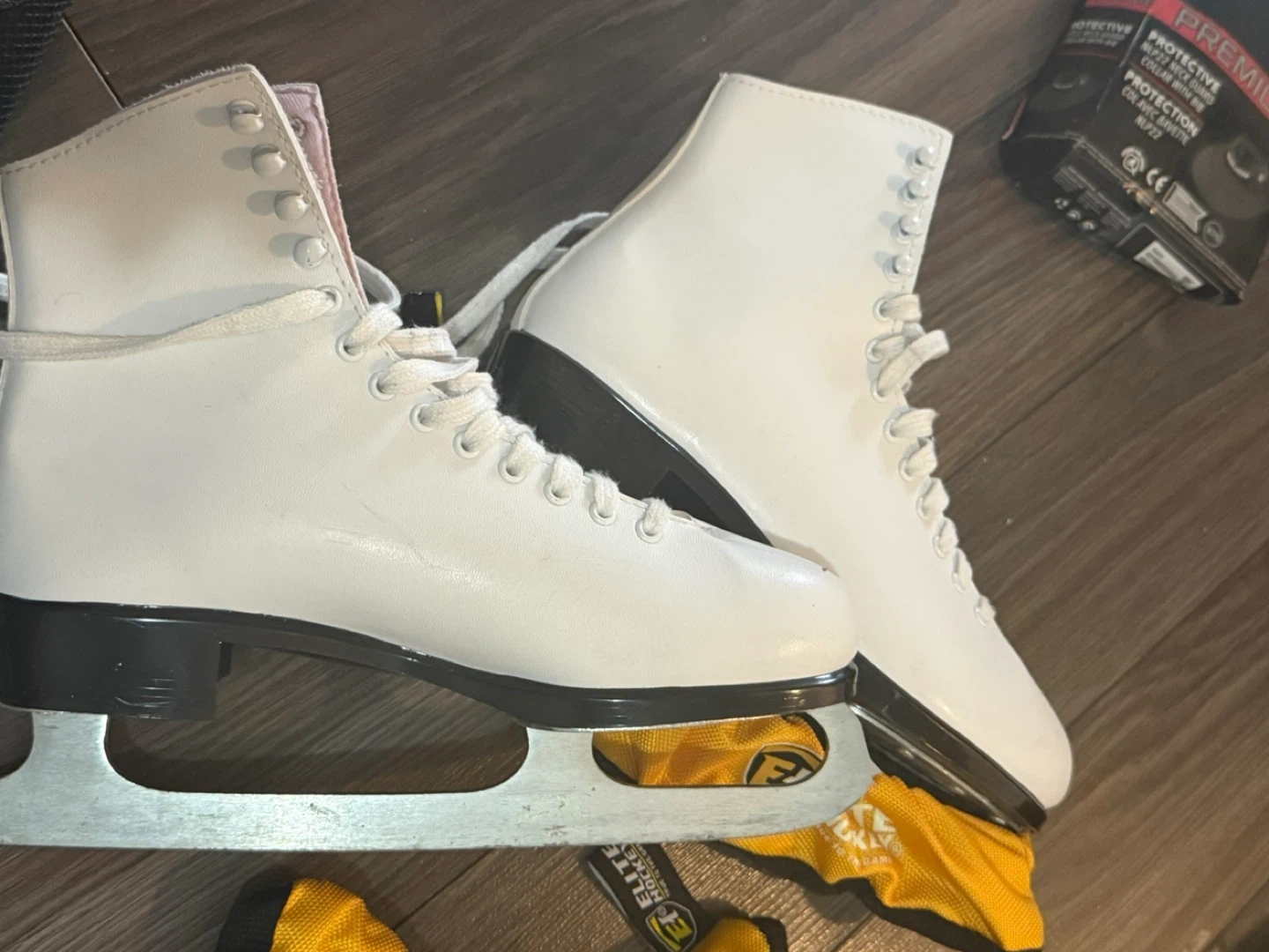 Selling a pair of white figure skates. They show some signs of use, but are still in good condition for hitting the ice! Perfect for beginners or recreational skaters