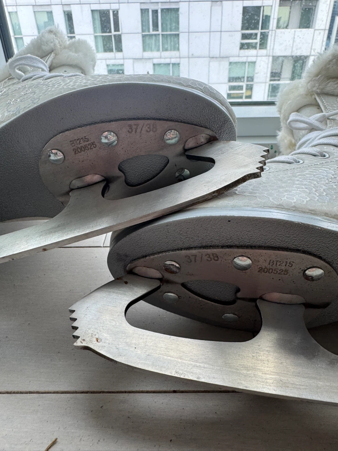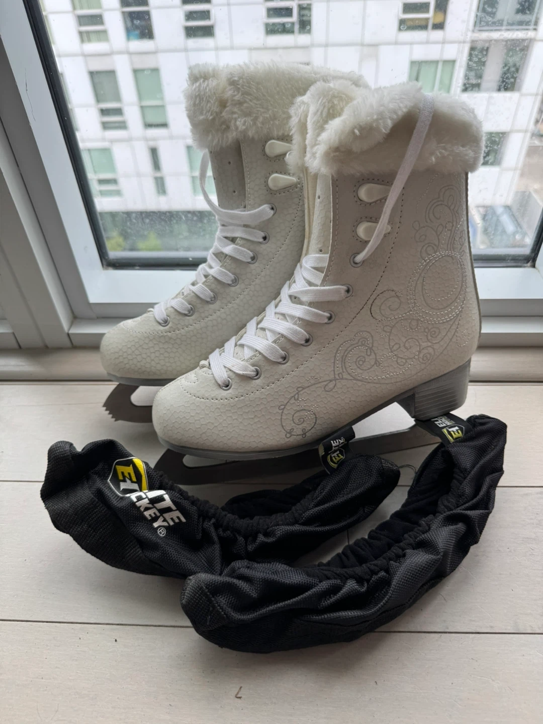 Selling a pair of figure skates in size 37/38. They're white with a lovely pattern and come with blade covers. Perfect for hitting the ice!