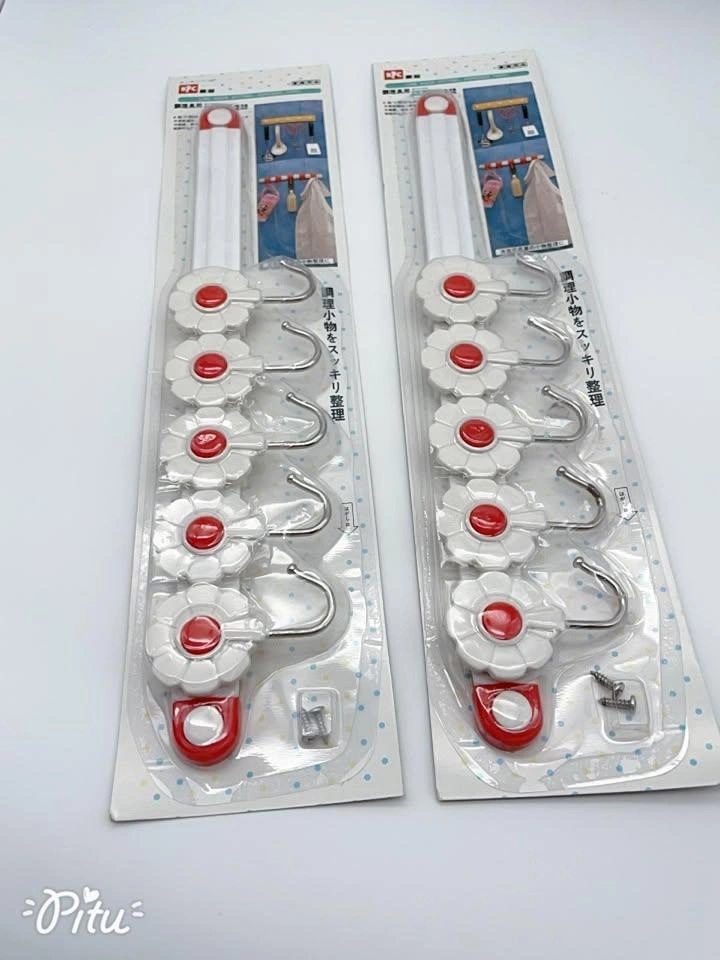 Two wall-mounted racks with five white flower-shaped hooks each, accented with red centers and includes screws for easy installation. Perfect for organizing kitchen or household items neatly.