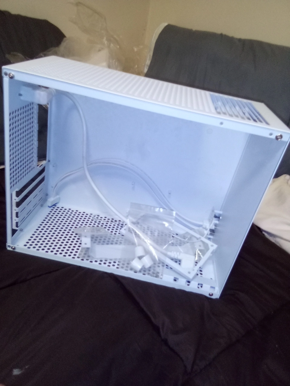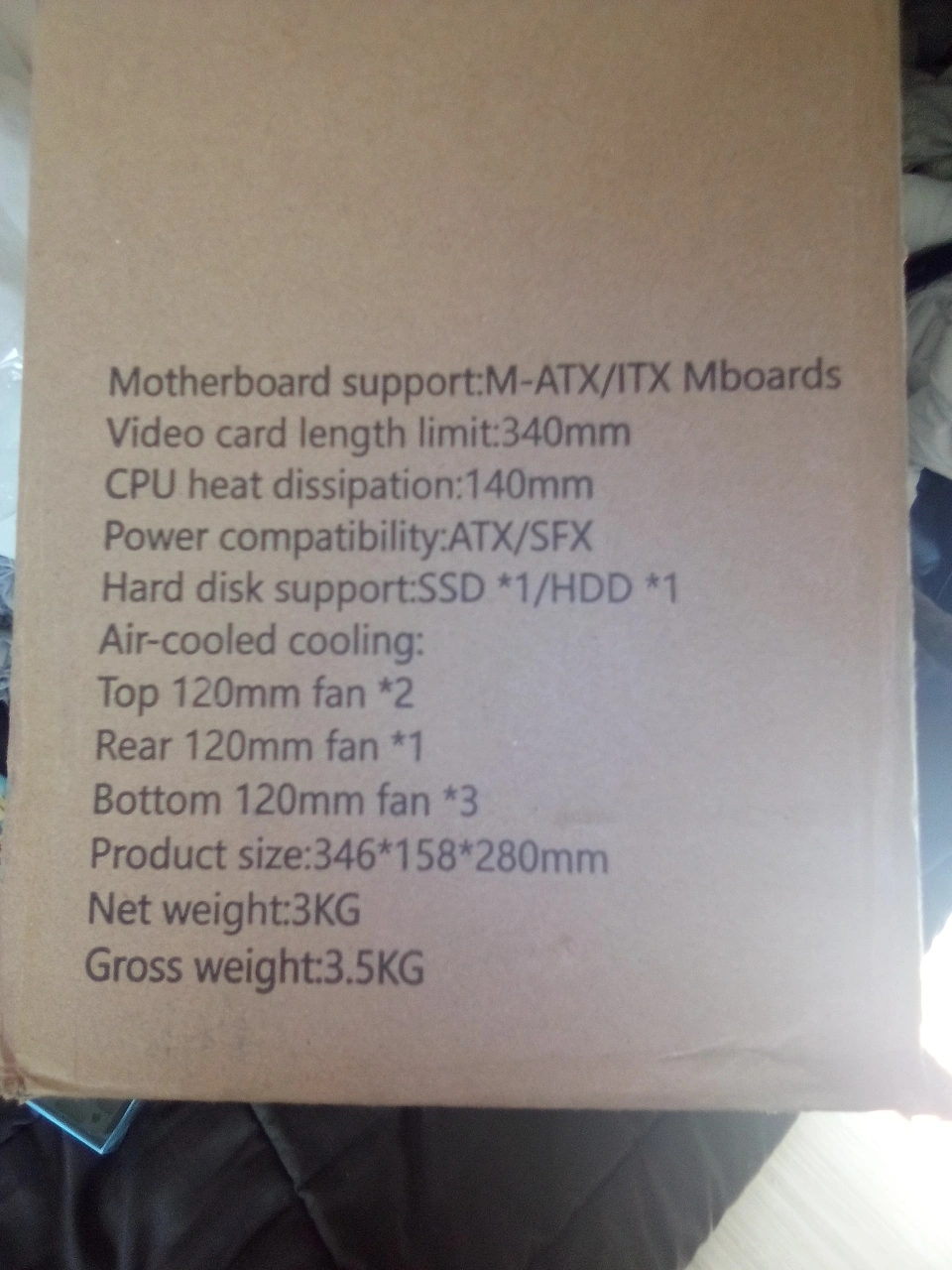 Selling a FormD T1 V2.1 PC case in white. It supports M-ATX/ITX motherboards, video cards up to 340mm, and both ATX/SFX power supplies. It can hold one SSD and one HDD. It has air-cooled cooling with: - Top 120mm fan *2 - Rear 120mm fan *1 - Bottom 120mm fan *3 Product size: 346*158*280mm Net weight: 3KG Gross weight: 3.5KG