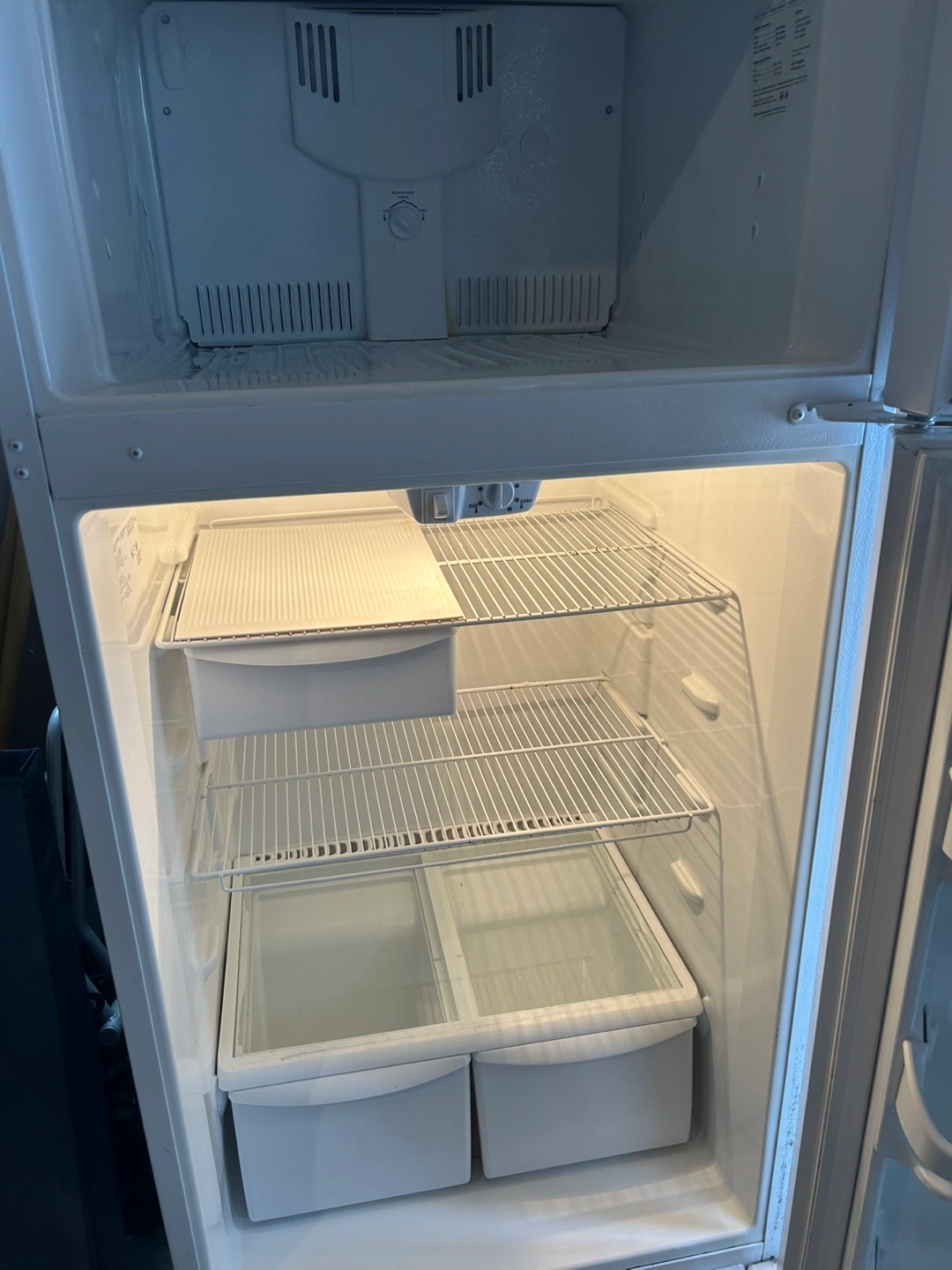 White top freezer refrigerator. Good used condition. Two crisper drawers. Multiple shelves. Pick up only - Haliburton Lake, Fort Irwin
